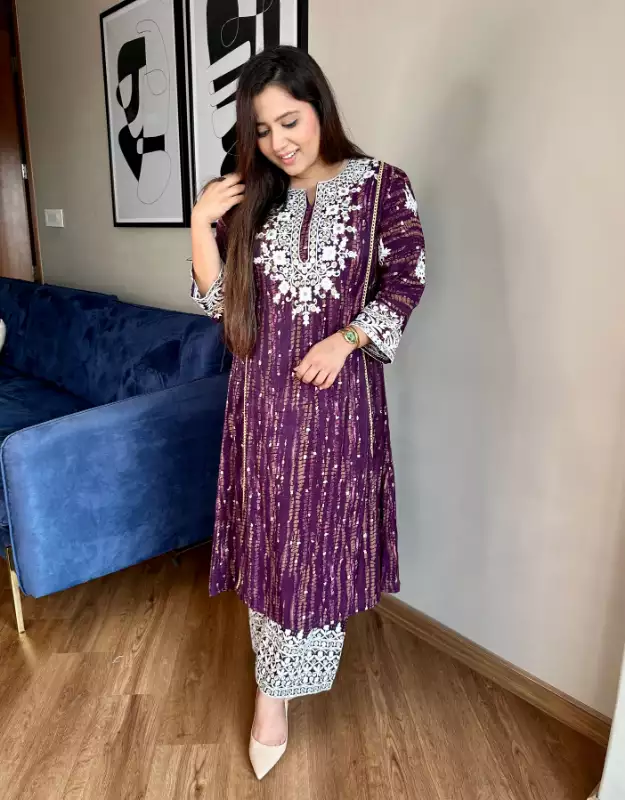Slight colour variation may occur due to different screen resolution.New in our smart and pretty Co-ord in semi muslin silk perfect for this wedding season.