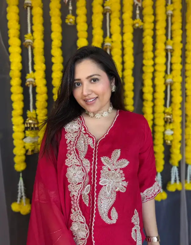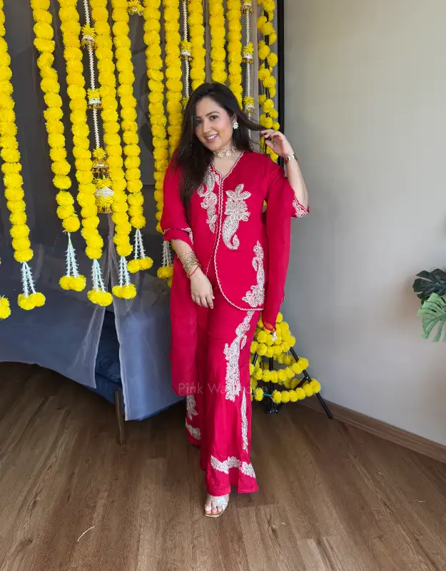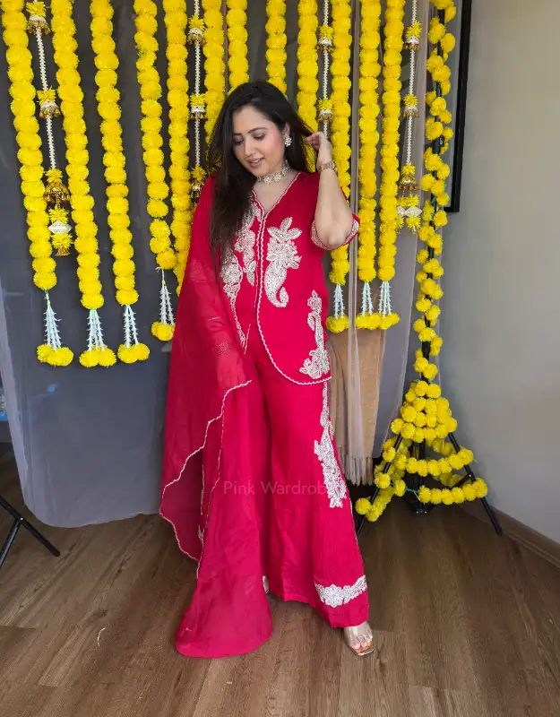 A stunning three-piece Indo-Western set featuring a fully embellished short top paired with smart, flowy bell-bottom pants in premium Russian silk. The look is completed with a delicate organza dupatta showcasing beautiful border work detailing. This chic and classy ensemble perfectly blends traditional elegance with modern flair — ideal for Diwali parties, weddings, sangeet nights, or festive celebrations.