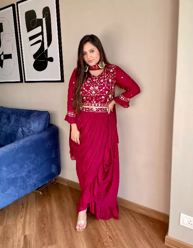 Beautiful drape skirt with a heavy embroidery blouse and a smart stole dupatta making it a perfect Indo-western option for your cousin/ friends mehendi , sangeet , cocktail or a wedding reception.
