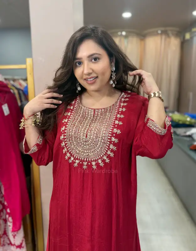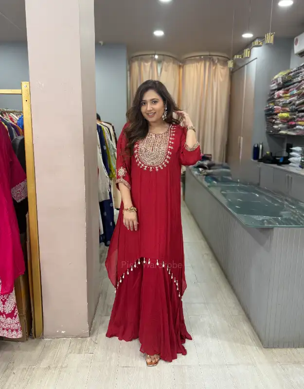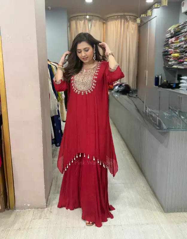 Perfect for Ganpati celebrations, Karva Chauth rituals, Diwali parties, or even wedding festivities, this Indo-Western ensemble blends comfort with glamour. The breathable Chinon fabric and relaxed silhouette make it an ideal choice – whether you’re attending a small Ganpati Puja at home or dancing away in a Ganpati Visarjan procession.