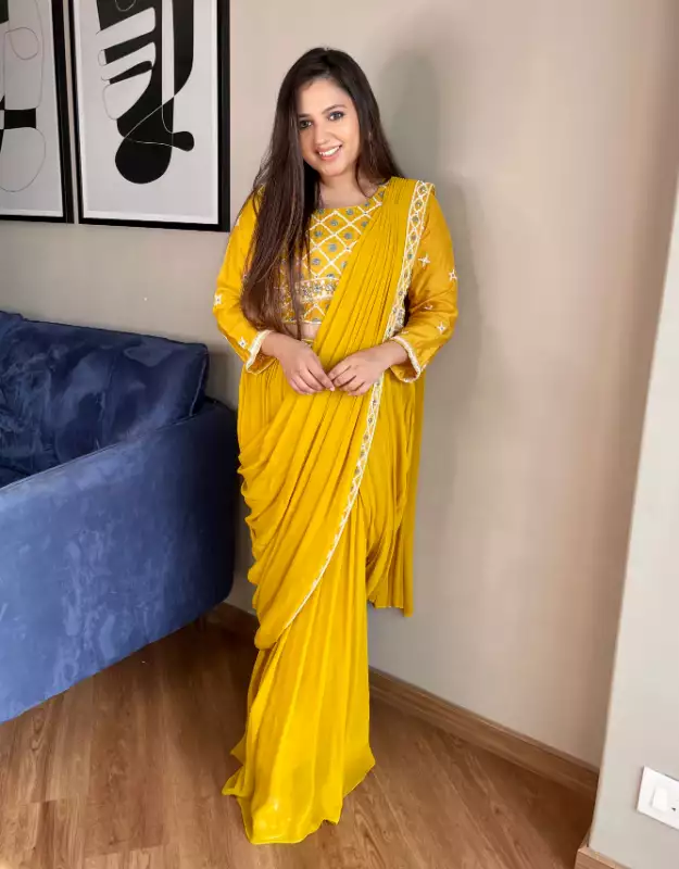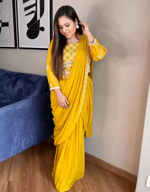 Your search for the perfect wedding option ends here! The dress features a Drape Saree in Pure Georgette.