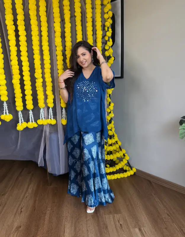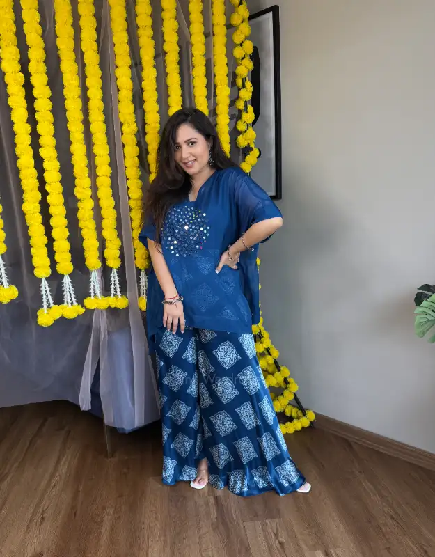 A stunning three-piece Indo-Western ensemble crafted in a deep royal blue hue, blending heritage with modern silhouettes. The set features a gorgeous Ajrak top adorned with delicate mirrorwork, paired with a fitted silk bustier for that chic contemporary touch. Completing the look are premium Gajji silk Ajrak print flowy palazzo pants that move effortlessly with grace.