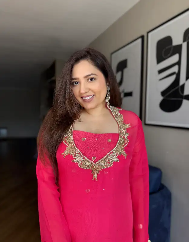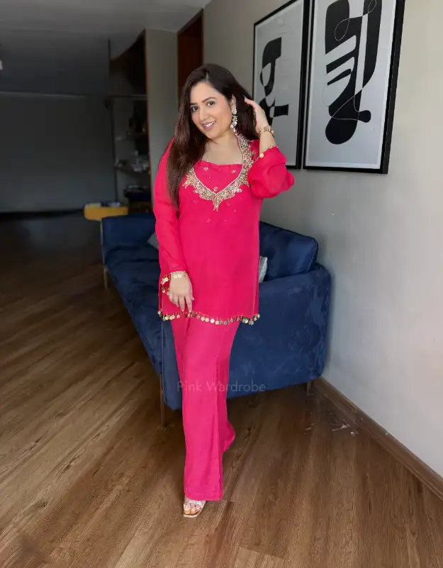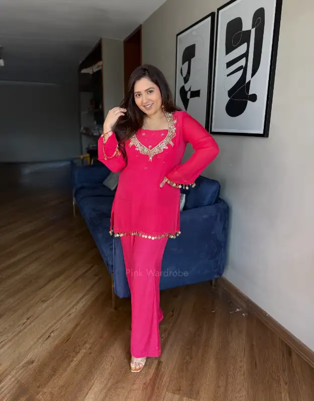 A stunning three-piece Indo-Western set crafted for the modern muse — featuring a pure organza cover-up with a deep neckline and intricate hand-done detailing. The cover-up is adorned with delicate coin embellishments on the hemline and sleeves, adding a chic festive charm. Paired with a silk noodle-strap bustier featuring intricate work detailing and flowy bell-bottom pants for that effortlessly graceful flair. This look perfectly balances tradition with trend — making it ideal for your sangeet nights, cocktail parties, or any wedding festivities. A fuss-free yet glamorous outfit that’s loved by both Gen Z and Millennials, flattering all body types and age groups.