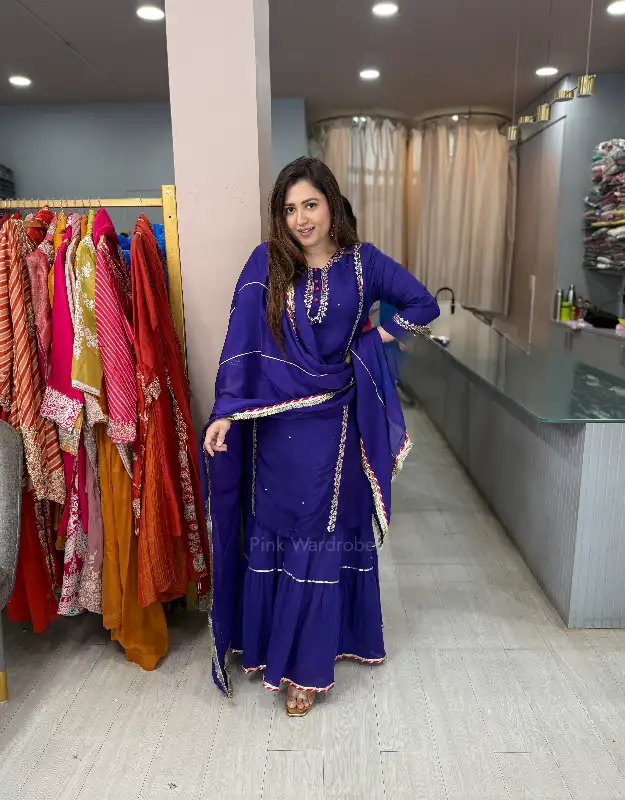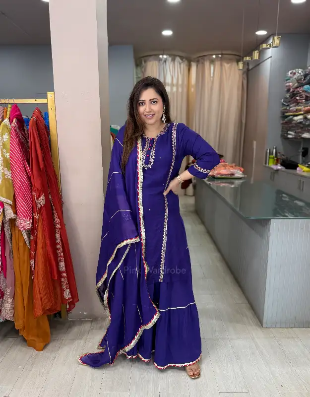 Think luxury wedding wear, statement ethnic silhouettes, designer sharara sets, premium Indian occasion wear, purple wedding outfits, and couture-inspired festive fashion—this one’s made to turn heads and steal hearts