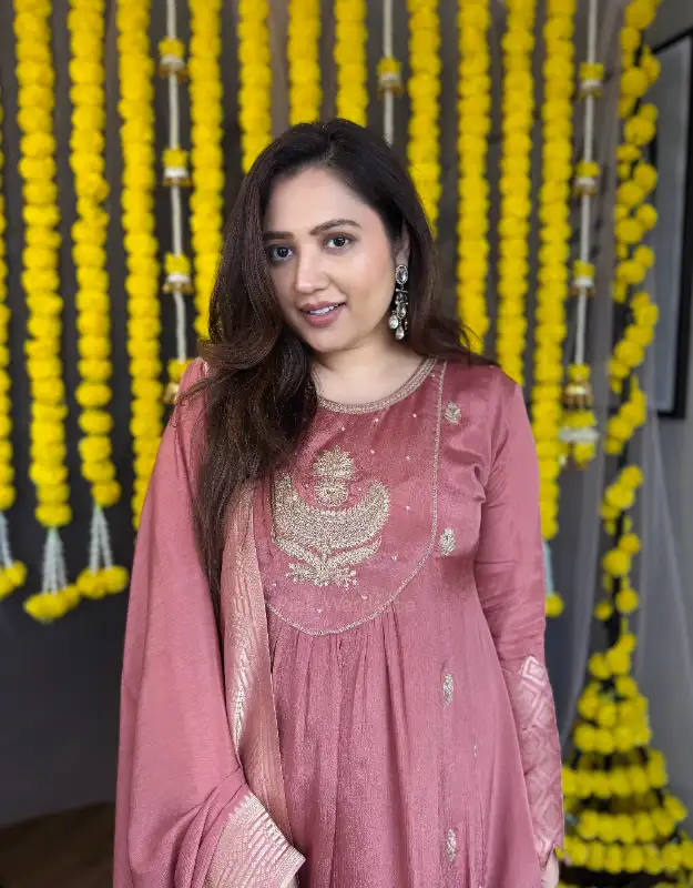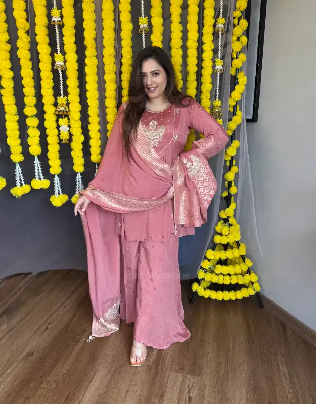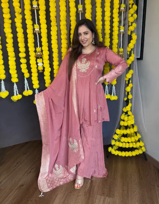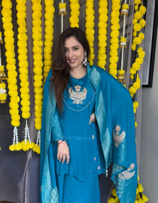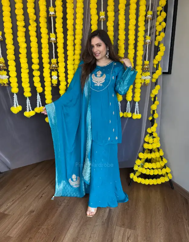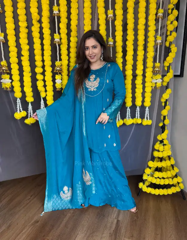 Experience timeless elegance with this luxurious Premium Chinon Kali-Cut Set, crafted for bridesmaids, wedding guests, and anyone seeking a statement festive look. The short kali-cut kurta features intricate hand-embroidered neckline detailing and zari-woven sleeves, creating a refined and regal silhouette. Paired with a fully embellished Chinon kali-cut sharara, the outfit drapes beautifully and gives a flattering, seamless fall that feels both glamorous and comfortable.