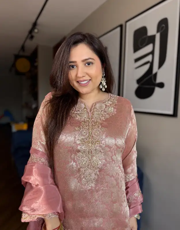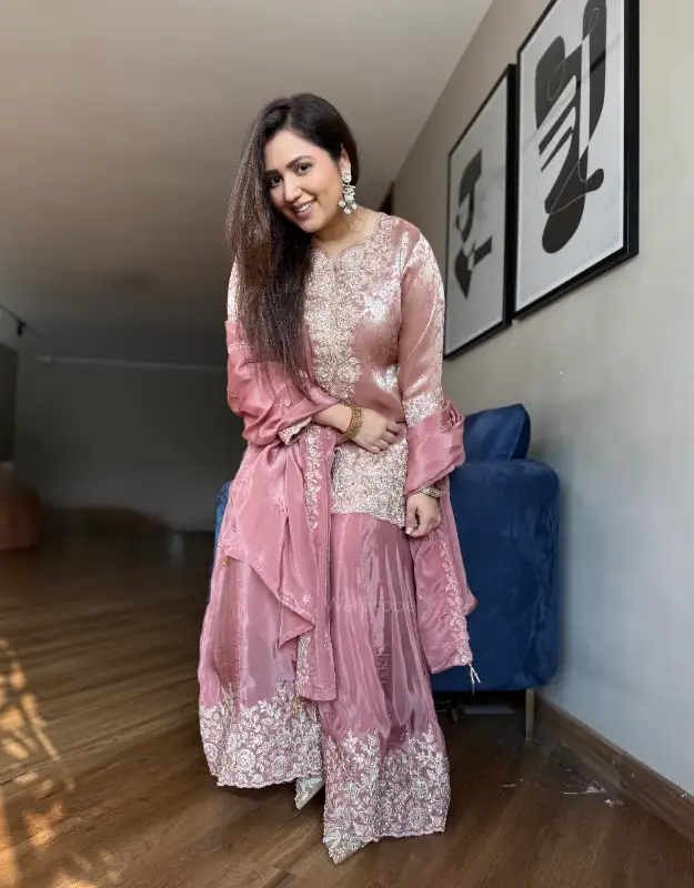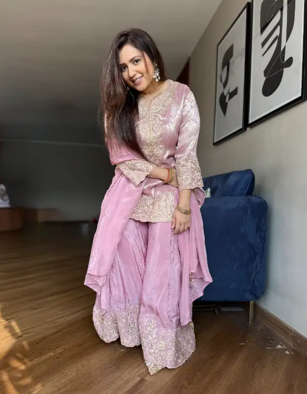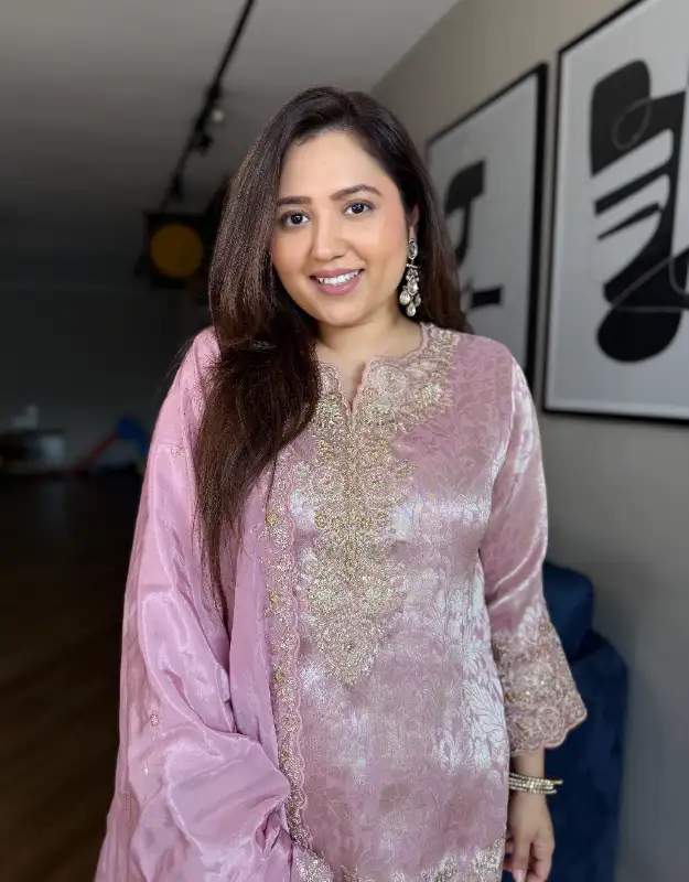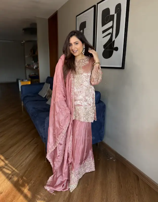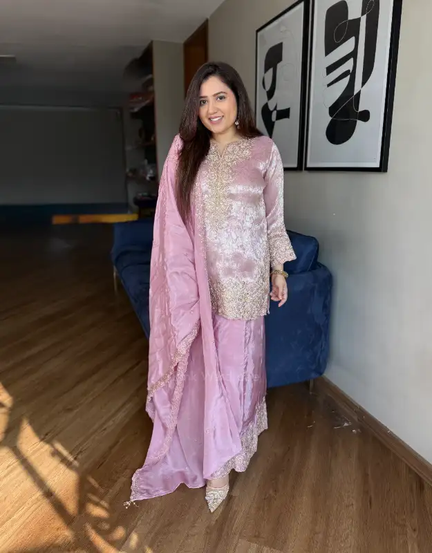 A stunning tissue jacquard short top set paired with a silk sharara, beautifully adorned with heavy embellishments on both the kurta and the sharara, making it a perfect statement outfit. The set is completed with a silk dupatta featuring intricate work detailing, adding just the right amount of festive glamour. The pastel color combinations exude grace, making it an elegant choice for weddings, sangeet, mehendi, or festive celebrations. This outfit blends traditional charm with modern sophistication, ensuring you shine at every occasion.