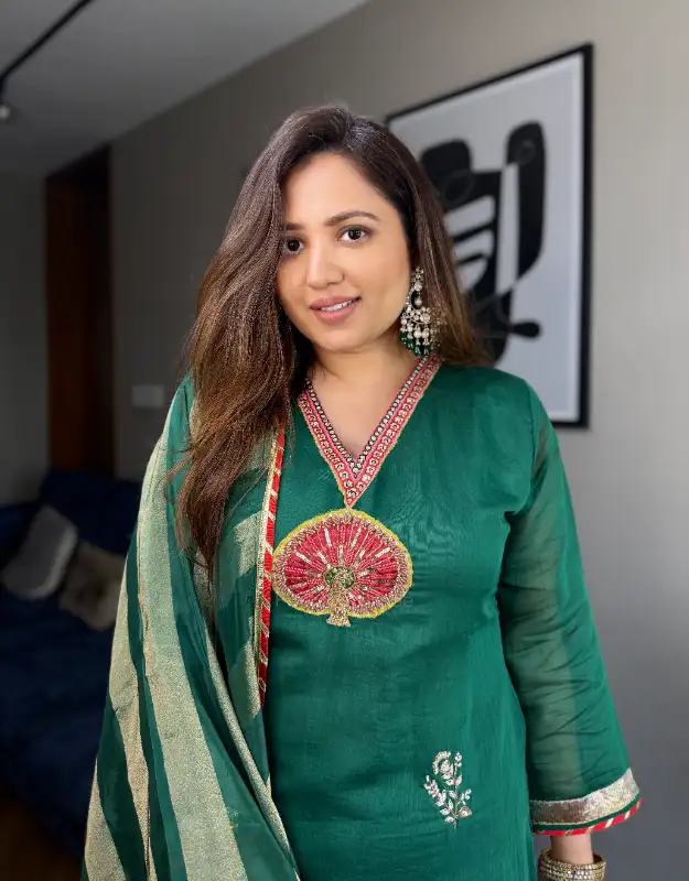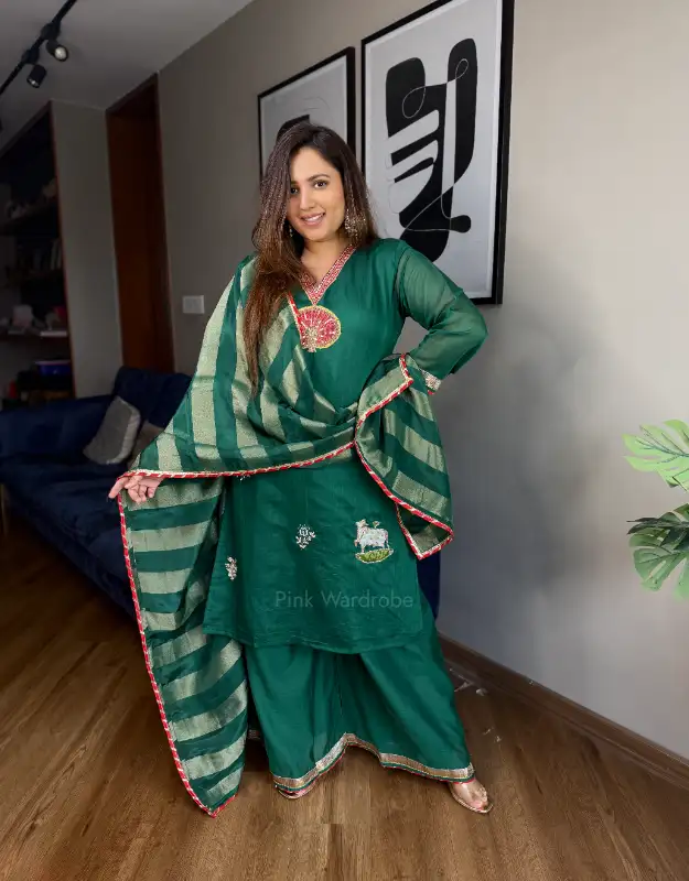 A stunning emerald green Mul Chanderi sharara suit crafted to make a statement at every celebration. The kurta is adorned with intricate handcrafted detailing and elegant Pichwai motifs all over, reflecting timeless artistry and festive charm. Paired with smart flared palazzo pants and a luxurious organza dupatta with zari weaving, this ensemble strikes the perfect balance between tradition and modern elegance. An ideal choice for Haldi & Mehendi functions, wedding festivities, pre-wedding parties, and elegant celebrations, designed for women seeking premium, graceful wedding wear.