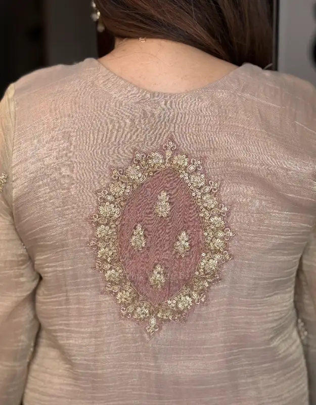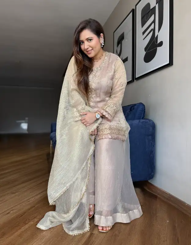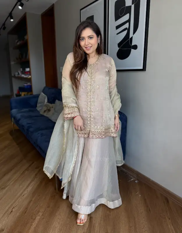 A statement of pure elegance — this luxury glass tissue sharara suit features a chic short kurta with heavy hand-embellished detailing, designed to shimmer beautifully under lights. Paired with smart crushed glass tissue flared sharara pants and a coordinated glass tissue dupatta, this ensemble delivers the perfect blend of regal and contemporary styling. Available in rich olive green and classic beige, it’s an exquisite pick for wedding trousseau shopping, haldi outfits, mehendi functions, cocktail nights, sangeet looks, sufi evenings, welcome lunches, and festive carnival parties. A premium choice for women who love designer ethnic wear in luxury fabrics with statement silhouettes.