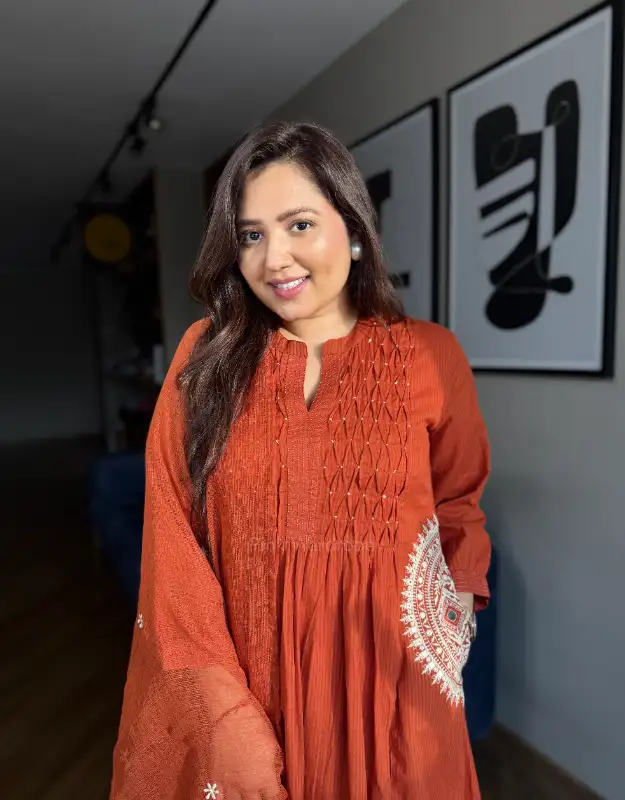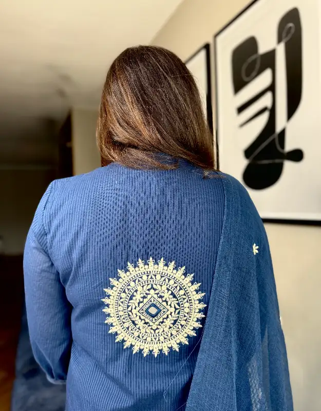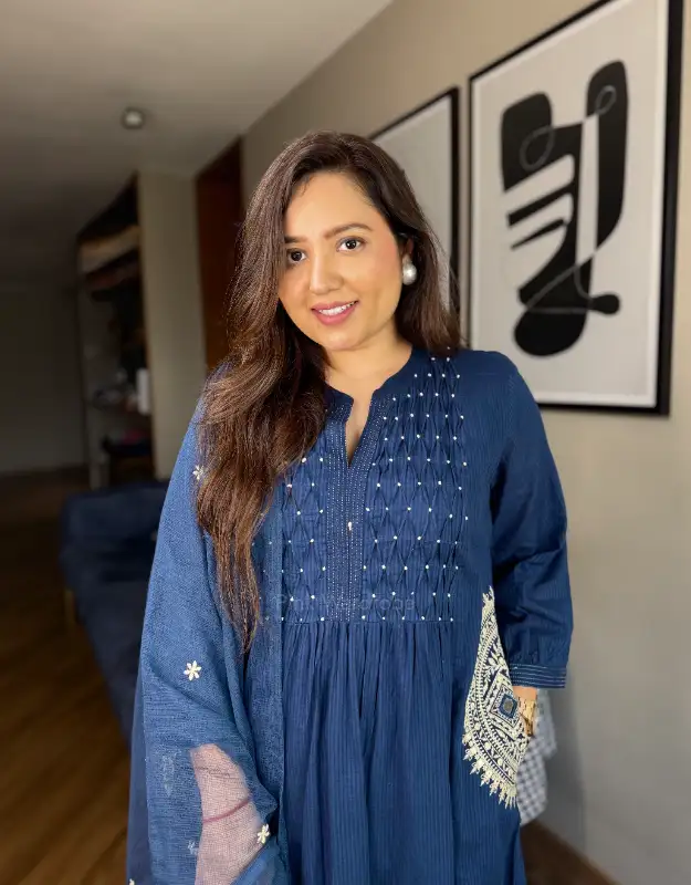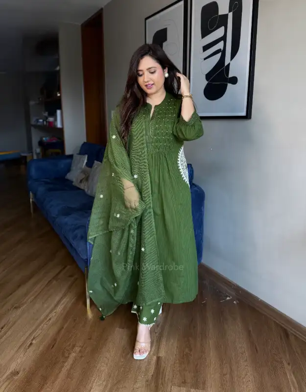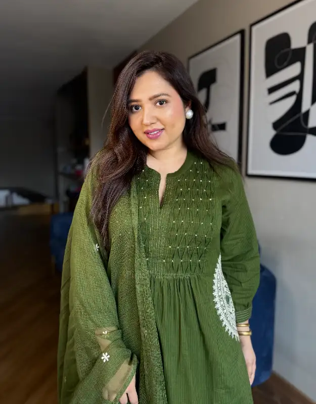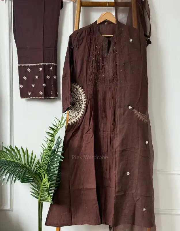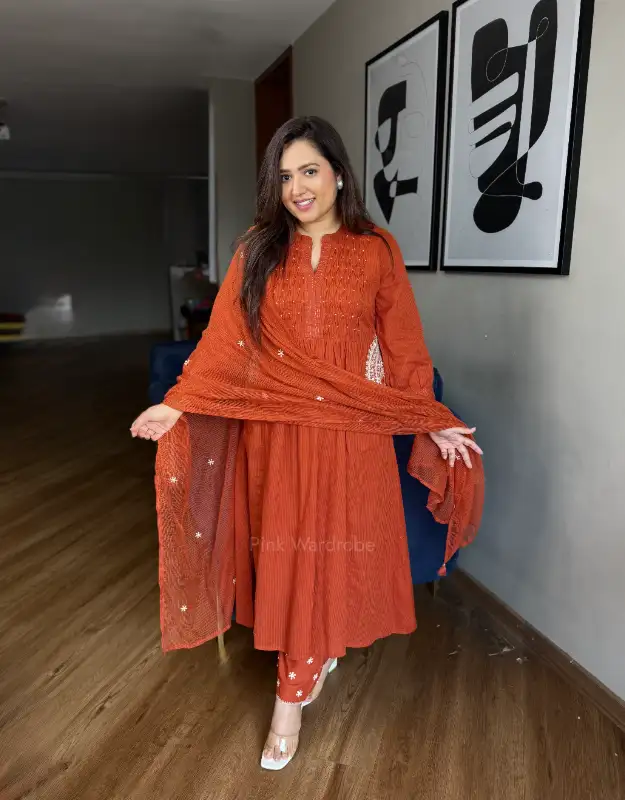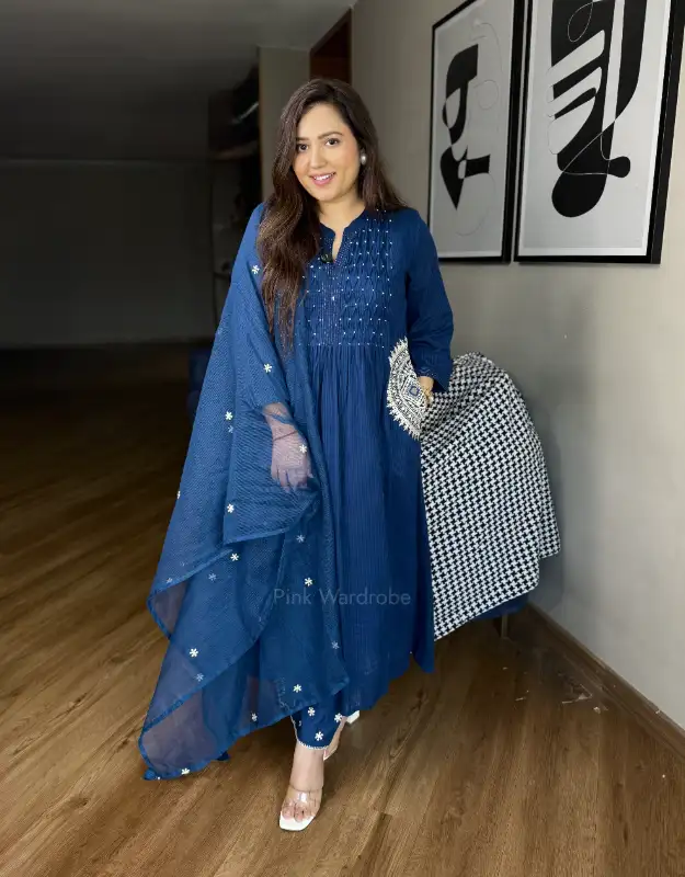 Crafted in premium Silly Cotton with inner lining, this elegant A-line suit set is a perfect blend of comfort and craftsmanship. The kurta features refined pleated & pin-tuck detailing on the neckline, beautifully enhanced with intricate embroidery and mirror work on both side pockets and the back. Paired with smart embroidered cotton pants and finished with a soft Cota Doria floral embroidered dupatta, this ensemble feels light, graceful, and effortlessly stylish. A versatile pick for festive gatherings, intimate weddings, parties, office celebrations, and elevated everyday wear.