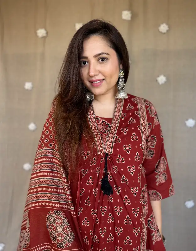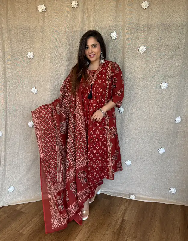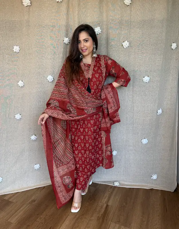A timeless premium cotton suit set crafted for women who love comfort with elegance. Designed in a flattering A-line silhouette with rich Ajrakh-inspired dual print detailing, this outfit features a smart V-neckline, one-side pocket, and tailored pants for effortless style. Paired with a soft breathable cotton dupatta, it’s the perfect blend of everyday luxury and heritage charm.