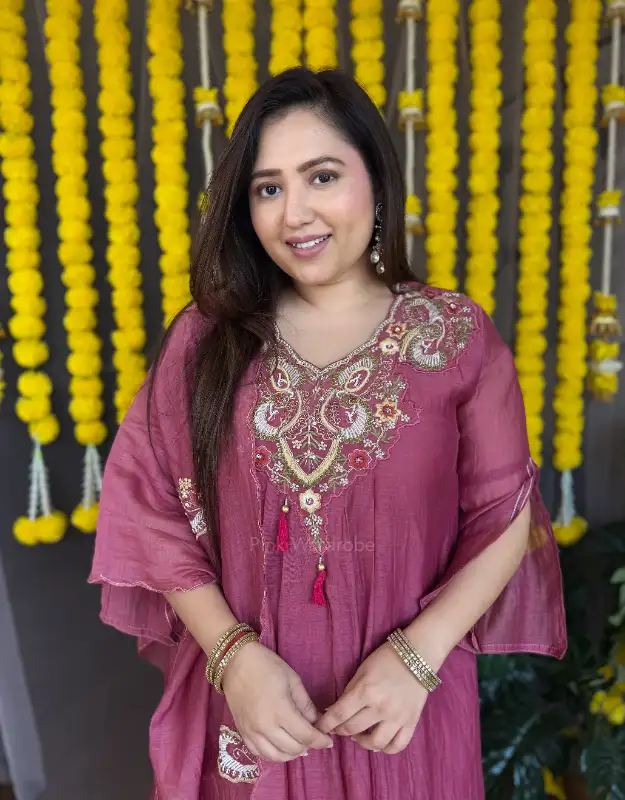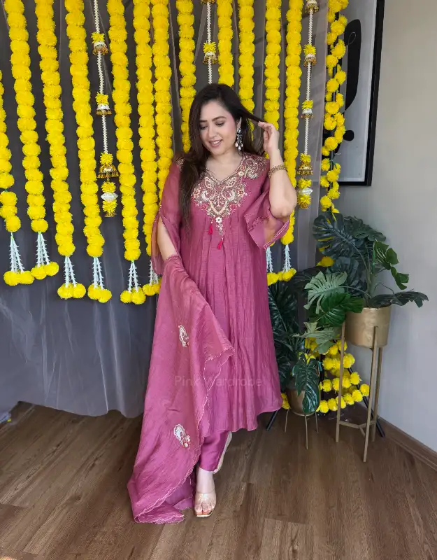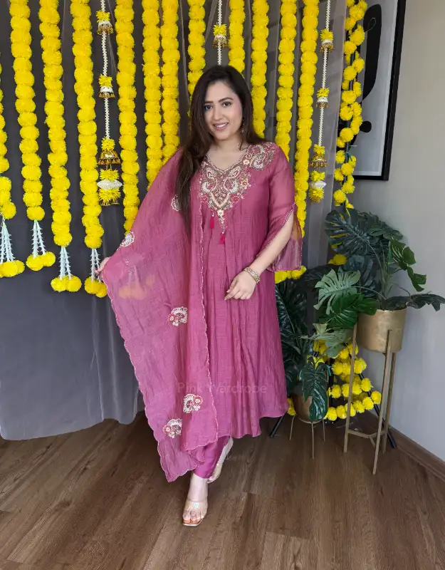 A classic Banarasi Mul Chanderi onion pink suit with a heavily hand-embroidered neckline. The kurta features elegant cut-out sleeves, paired with pants and an intricately embroidered stole-style dupatta. Soft, premium, and extremely flattering — perfect for wedding trousseau, engagement dinners, and festive evenings.