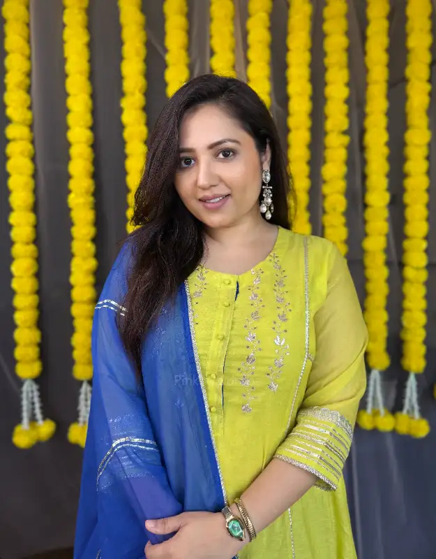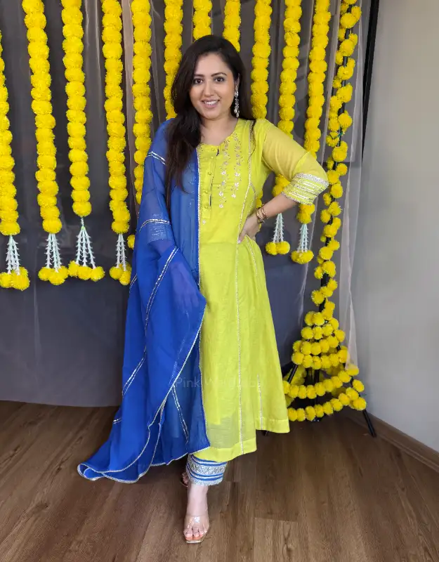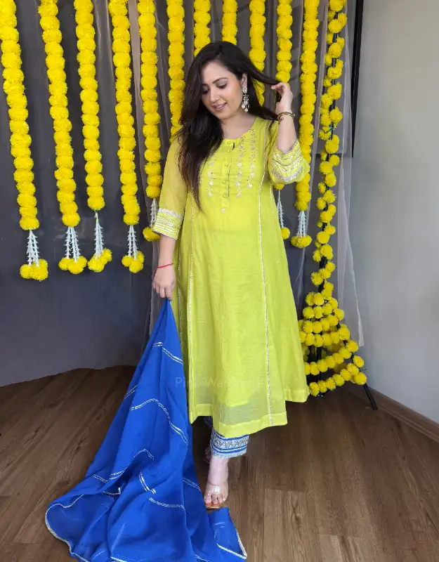 A graceful lime green malchanderi kurta adorned with lace work, gota lace, and intricate marodi work detailing on the neckline and sleeves. Paired with elegant contrast blue jam cotton pants with lace gota accents and a pure organza dupatta in blue with lace gota detailing all over, this ensemble offers the perfect festive contrast. An ideal choice for Diwali parties, wedding functions, or grand celebrations, blending tradition with timeless elegance.