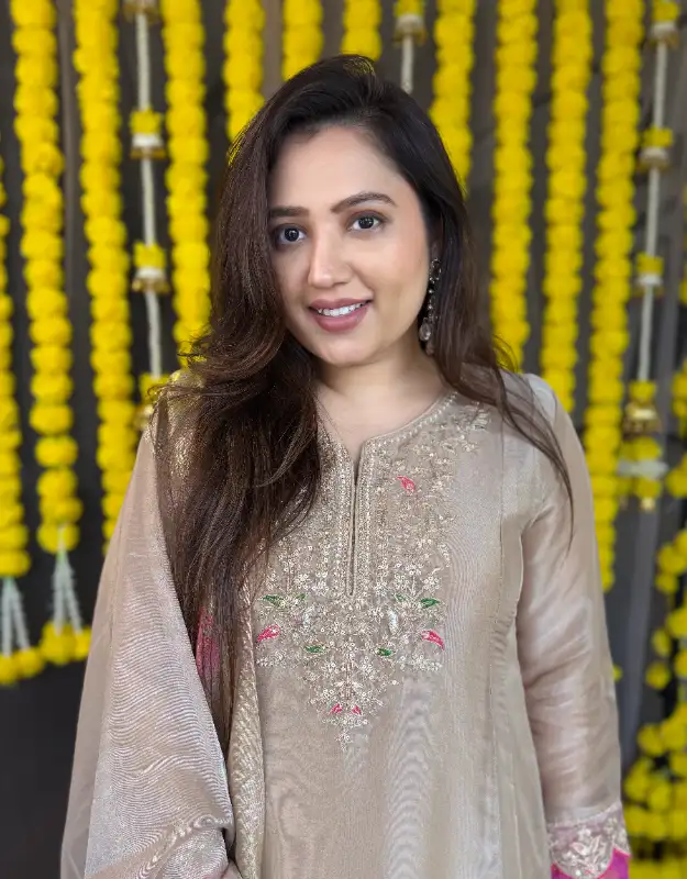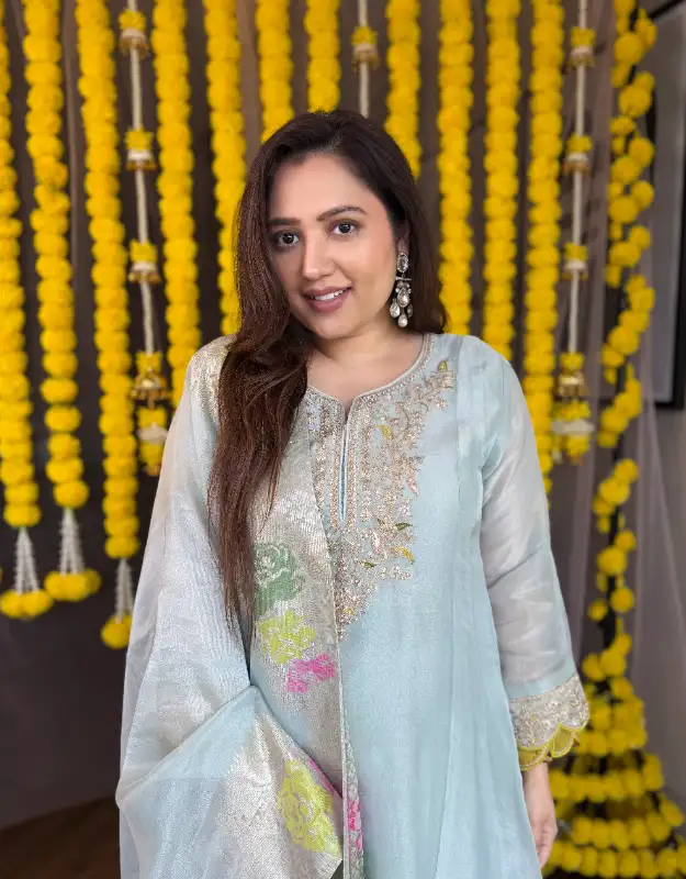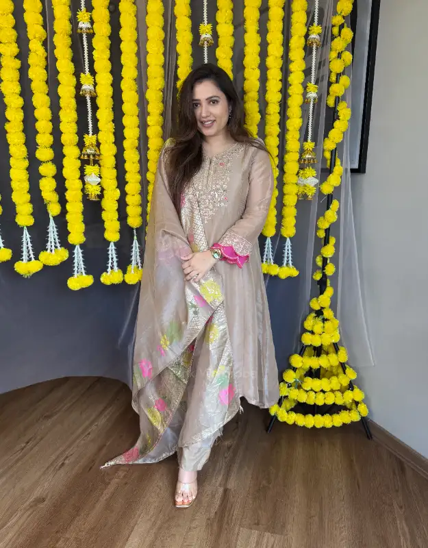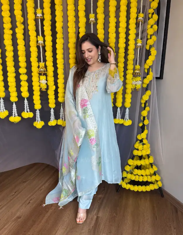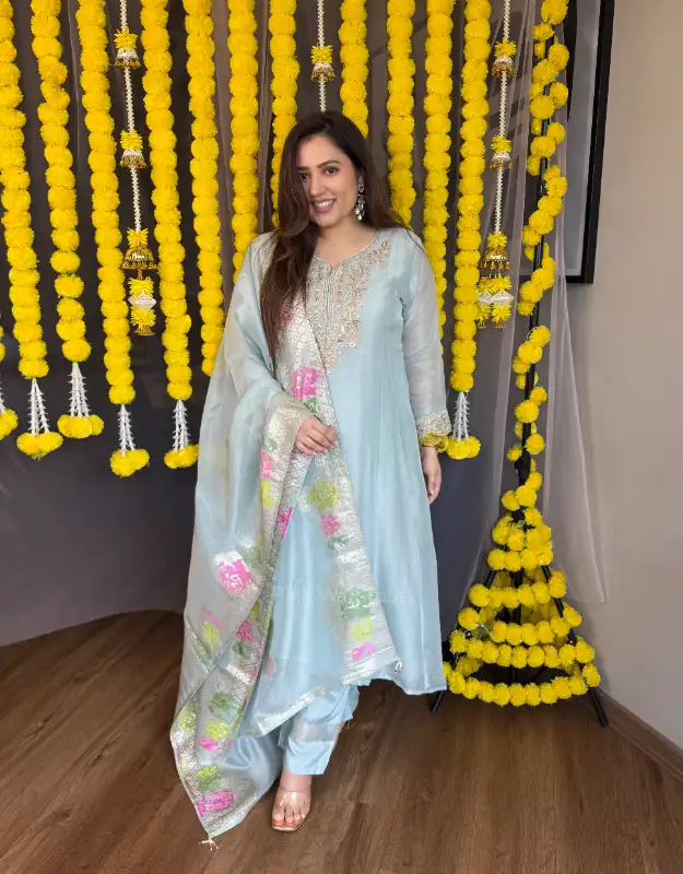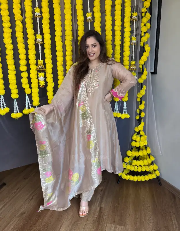 A timeless premium tissue Anarkali suit featuring intricate work detailing on the neckline and sleeves, paired with a luxurious zari-woven dupatta for a refined festive finish. The soft sheen and graceful flare give it a rich, elegant appeal—perfect for weddings, festive celebrations, and special occasions.