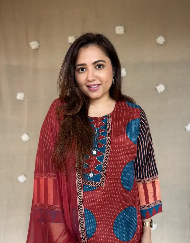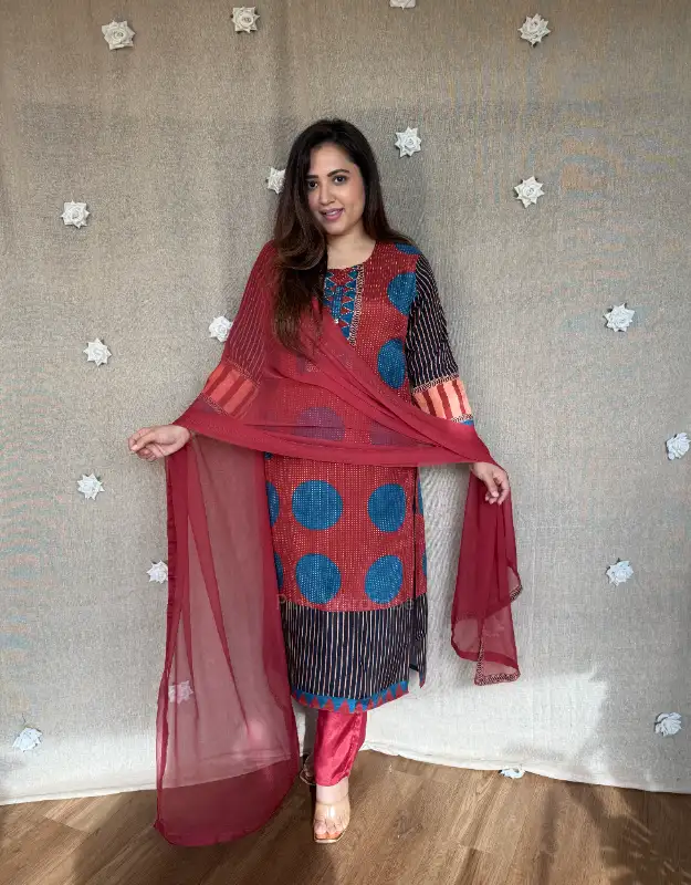 Graceful maroon polka Ajrak print paired with maroon pants and chiffon dupatta. Feminine, timeless, and effortlessly elegant — ideal for pujas, intimate celebrations, and classy everyday wear.