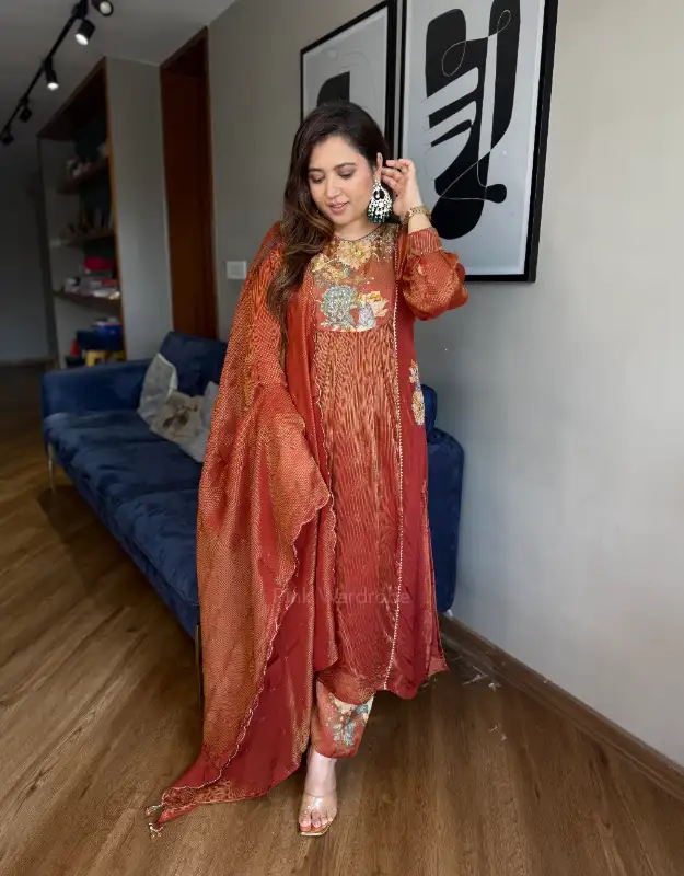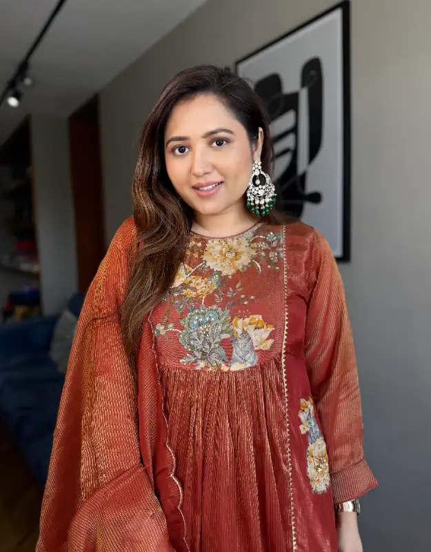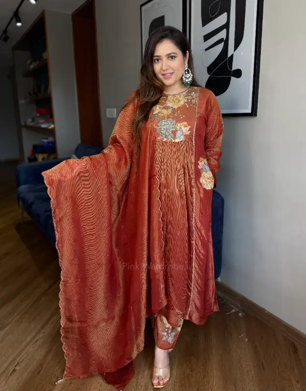 An elegant A-line suit crafted in premium tissue, featuring a delicate floral motif on the neckline paired with a refined band detailing. The kurta is thoughtfully designed with pockets on both sides and paired with smart pants adorned with subtle floral print motifs. Finished with a luxurious tissue silk dupatta, this ensemble strikes the perfect balance between timeless elegance and modern comfort—ideal for weddings, festive celebrations, special occasions, and refined evening gatherings.