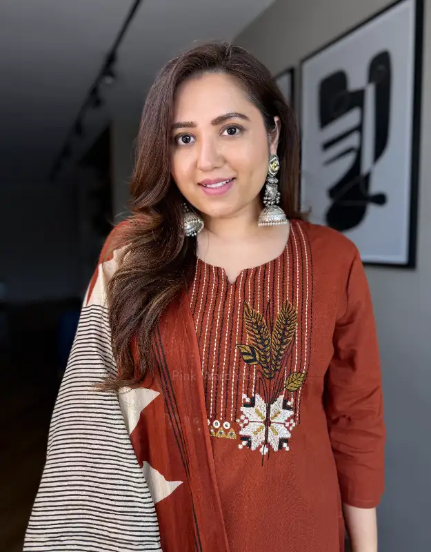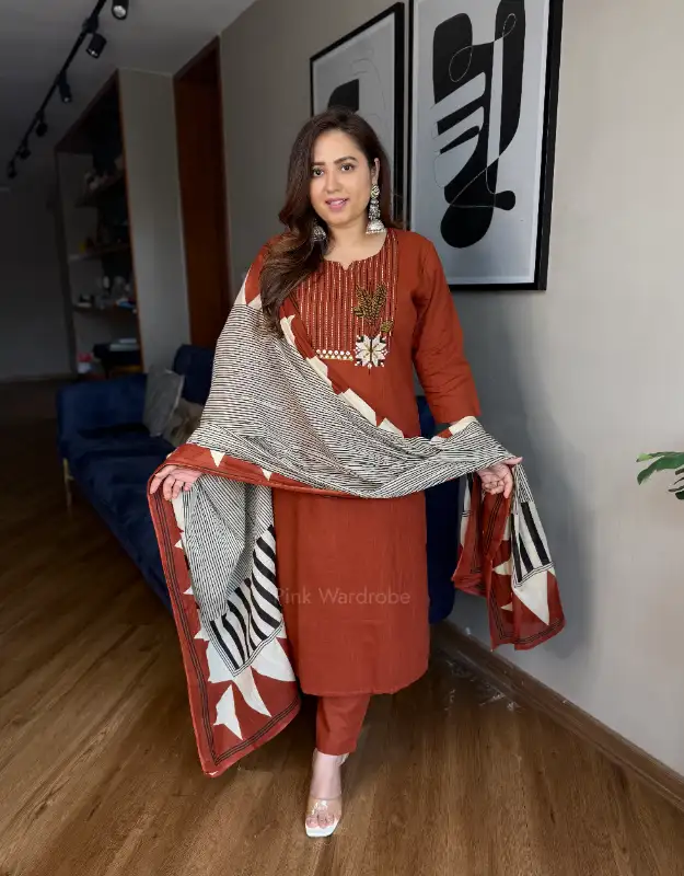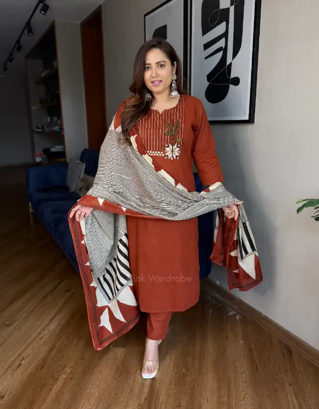 Crafted for effortless elegance, this premium pure cotton ethnic suit set is your perfect go-to for summer daily wear and office wear styling. The kurta features a soft A-line silhouette with delicate neckline embroidery detailing and a functional one-side pocket, blending comfort with subtle sophistication. Paired with smart cotton pants in a rich rust tone, the set feels breathable, lightweight, and ideal for all-day wear.