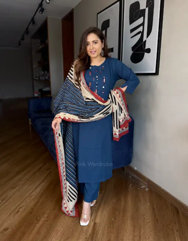 Introducing our elegant premium cotton A-line suit set, crafted for women who love effortless style with everyday comfort. Featuring a beautifully tailored A-line kurta adorned with handcrafted real mirror work detailing, paired with smart straight pants for a sleek and flattering silhouette. The highlight of this ensemble is its stunning premium Ajrak geometric print cotton dupatta, adding an artistic and aesthetic charm to the entire look.