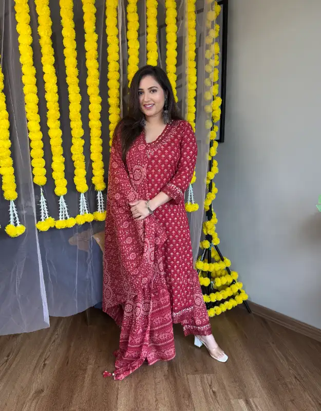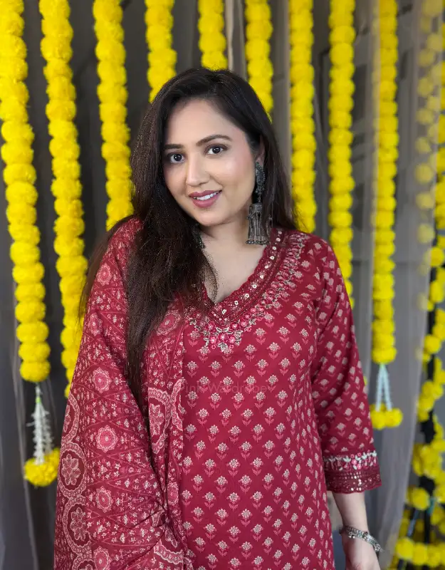 Introducing our Cotton Ajrakh Printed Brown Suit, perfect for both daily wear and office wear. This elegant piece features a traditional Ajrakh print in rich earthy tones, crafted from soft, breathable cotton for all-day comfort. The intricate embroidery details on the neckline, sleeves, and hem add a subtle festive touch, making it versatile for special occasions as well. Whether you’re heading to work or a casual event, this suit seamlessly blends tradition with modern elegance.