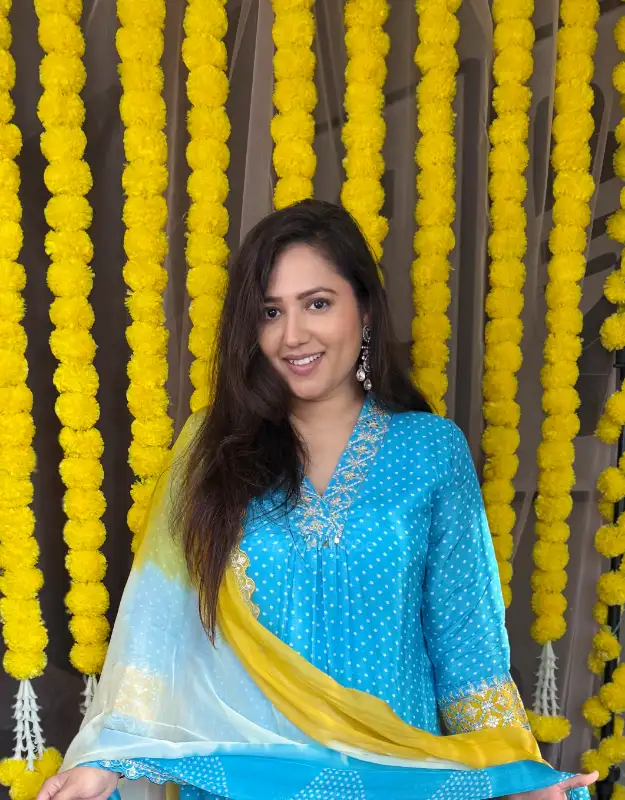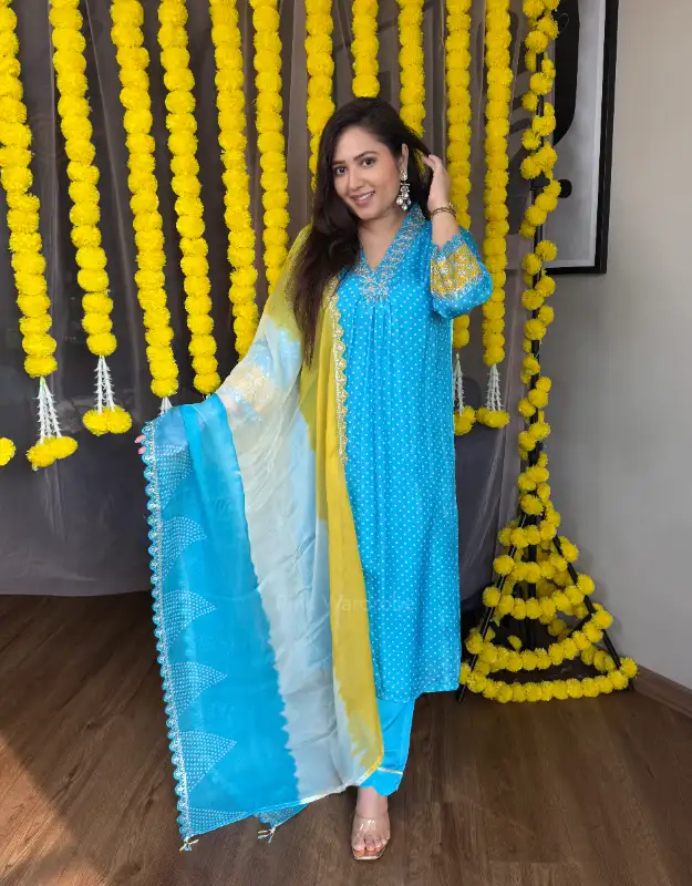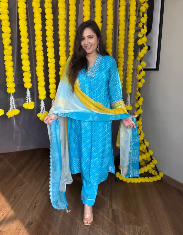Introducing “Bandhejni Aarzu” – a stunning A-line kurta set crafted in luxurious Russian Silk with the iconic Bandage (Bandhej) print, loved by celebrities like Neeta Ambani and Deepika Padukone. The kurta features a flattering V-neckline with intricate handwork on the neckline and sleeves, making it a true standout piece. Paired with smart tailored pants and a breathtaking three-tone premium organza dupatta, this ensemble offers a perfect balance of tradition and elegance.