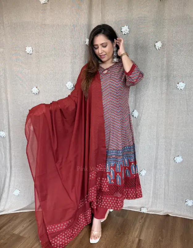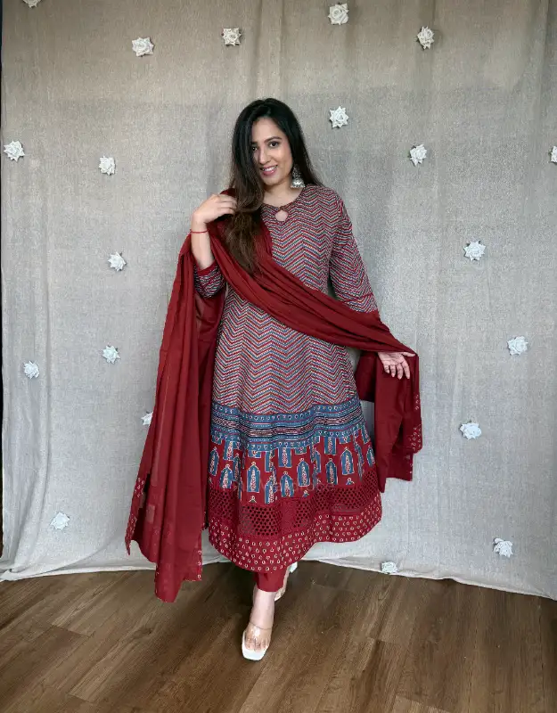 Red geometric Ajrakh print kali Anarkali featuring intricate Schiffli detailing on the kurta, paired with a soft cotton dupatta — breezy, graceful, and perfect for everyday elegance.