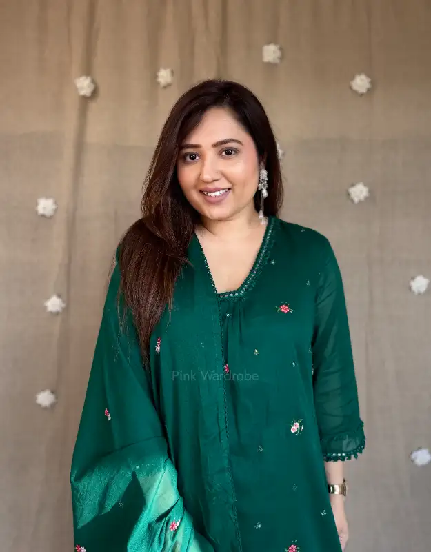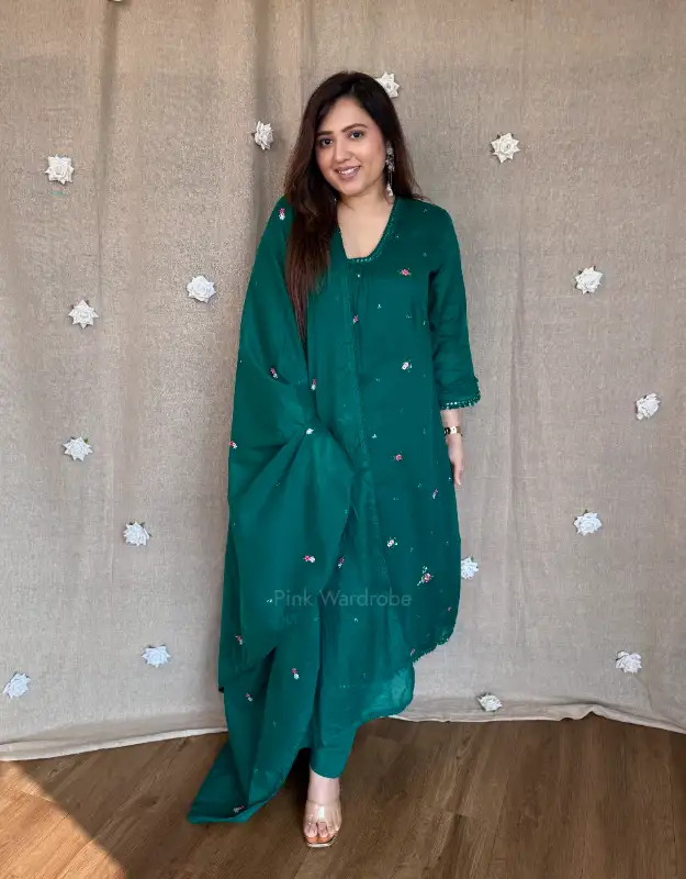 Elevate your everyday style with this bottle-green Mul-Mul Cotton Suit, delicately adorned with small dainty all-over embroidery for a refined and graceful look. The elegant glass-shaped neckline adds a modern touch, while the A-line silhouette paired with smart pants ensures comfort with a polished finish. Completing the set is a soft mul-cotton dupatta, beautifully embroidered with tiny floral motifs that add subtle charm and sophistication.