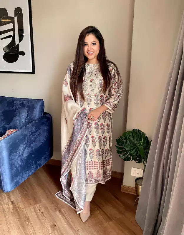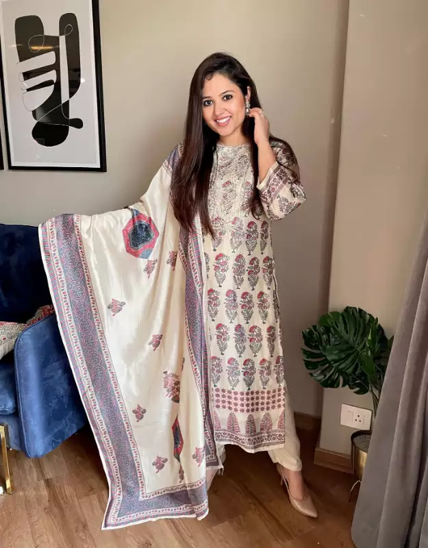 Slight colour variation may occur due to different screen resolution.Beautiful digital printed bemberg silk suit with detailed embroidery on neck perfect for any function.