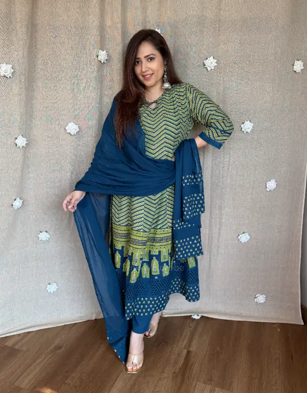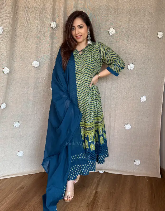 Green & blue geometry Ajrakh print Anarkali with soft cotton dupatta, accented with crochet and Schiffli lace border — breezy, elegant, and perfect for everyday wear.