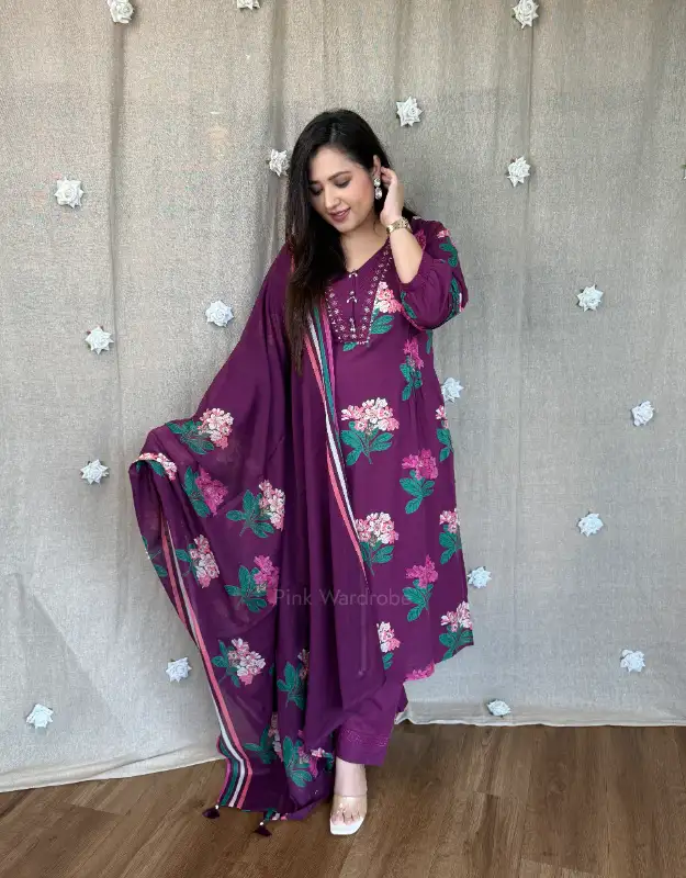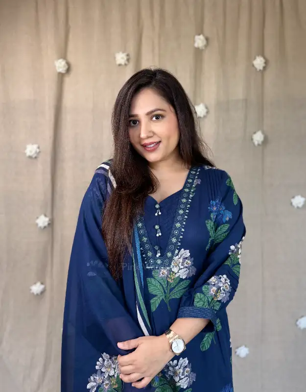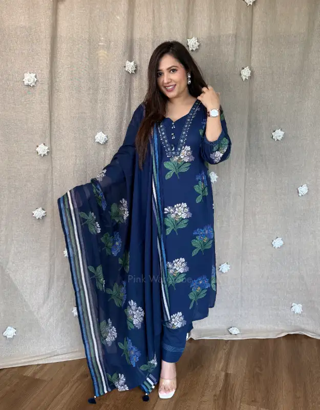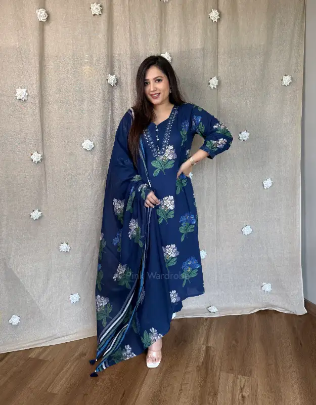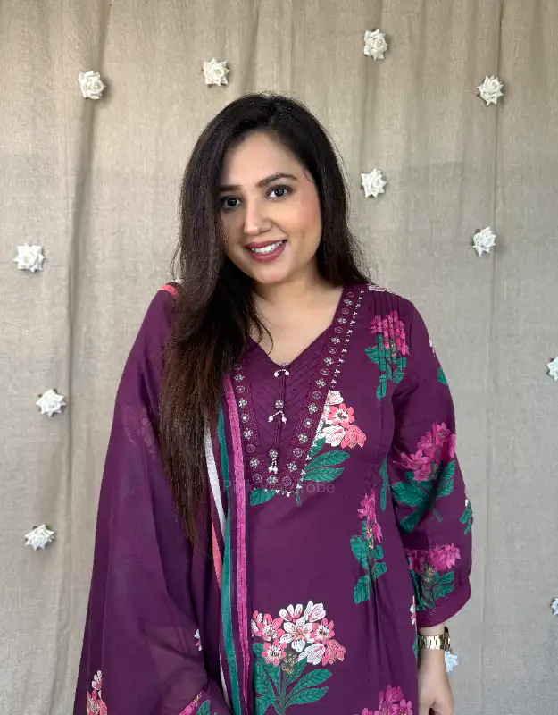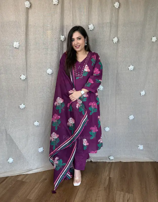 Get dresseed for your office or daily wear in our premium cotton A-line suit. kurta is in a-line patter having pockets on both sides. Entire suit has lace detailing comes with smart comfortable pants and a soft mul cotton duptta.