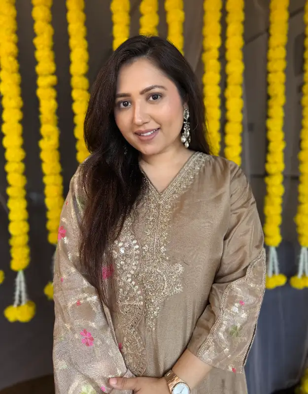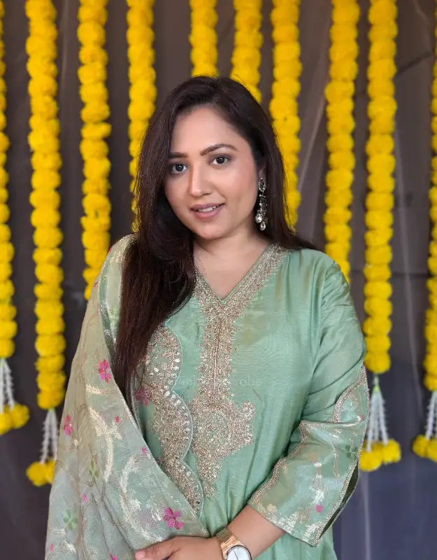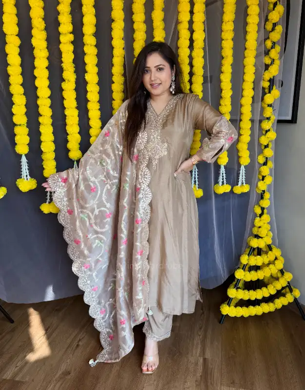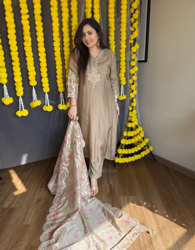 A timeless masterpiece — this beautiful Russian silk suit comes in a flattering A-line silhouette, featuring intricate handwork detailing on the neckline that adds a touch of refined elegance. Paired with smart pants, the set is completed with a luxurious pure tissue dupatta adorned with Jamdani weaves all over, giving it a rich brocade-inspired look. The scallop border detailing enhances its regal charm, while the classic beige hue makes it a versatile choice for any wedding, festive party, or elegant function. This statement ensemble can also be styled in multiple ways, easily teamed with other dupattas for a fresh look every time.
