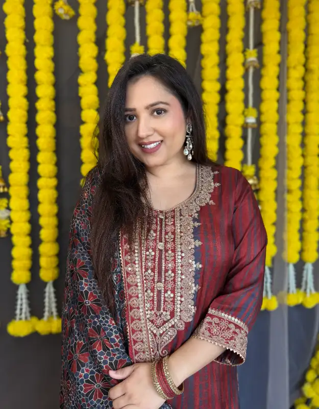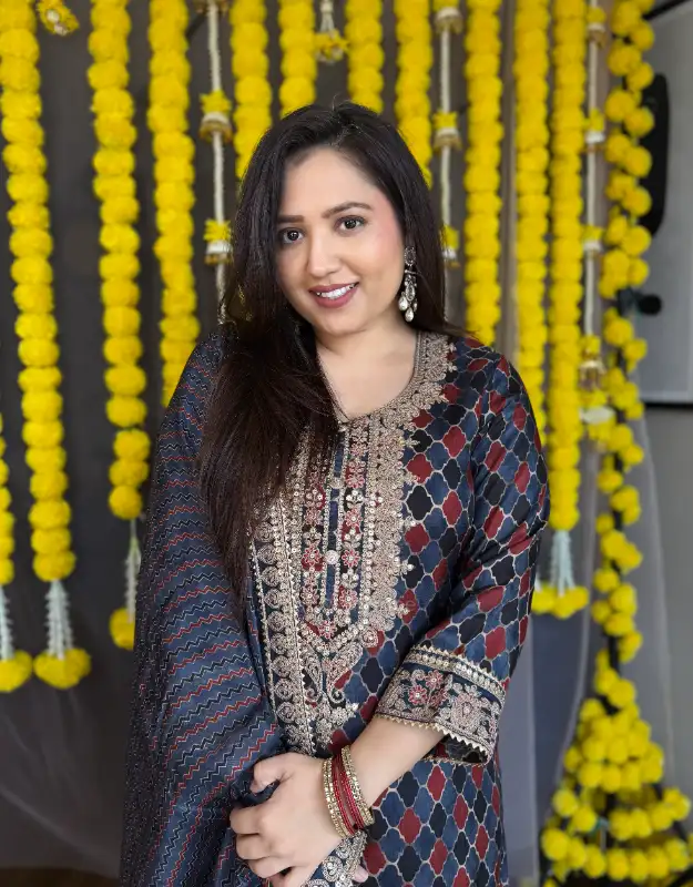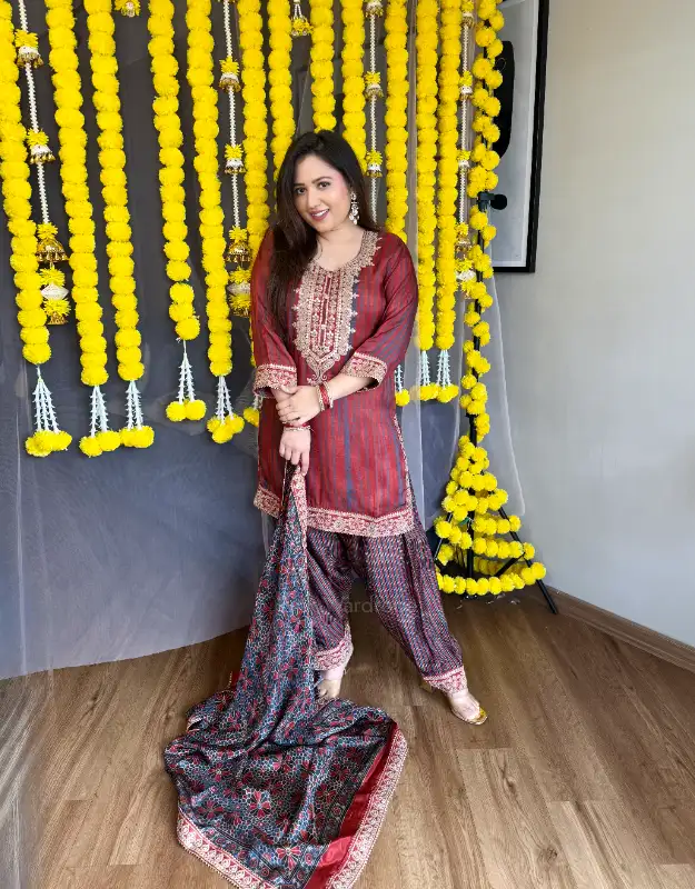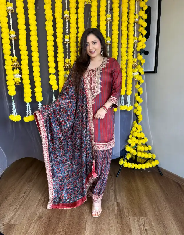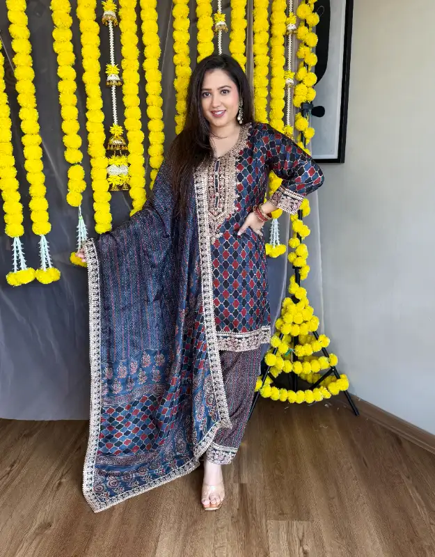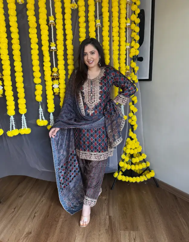 A beautiful Russian silk kurta paired with a smart farshi salwar pant and a glass tissue dupatta, all adorned in exquisite pure Ajrak print. The entire set features intricate work detailing on the kurta, bottom, and dupatta, giving it a rich and elegant festive charm. This ensemble is a perfect blend of tradition and sophistication, ideal for any festival, occasion, or wedding celebration. A timeless classic to add grace and heritage to your festive wardrobe.