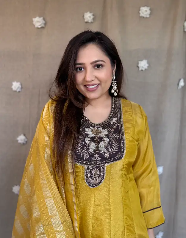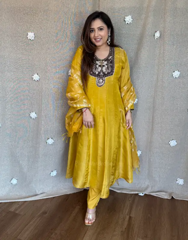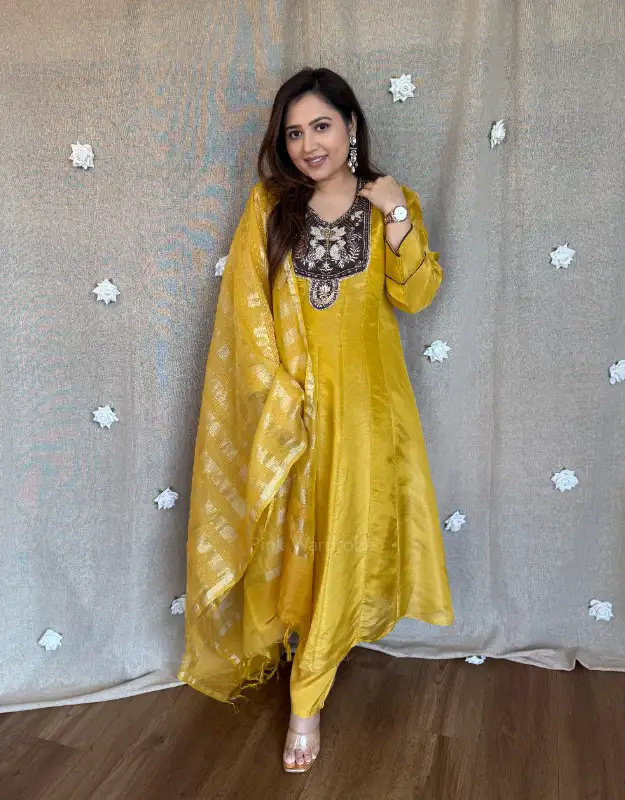 An elegant Crepe Tissue Anarkali featuring intricate handcrafted detailing and a soft, flowing dupatta — ideal for Mehendi ceremonies & festive evenings.