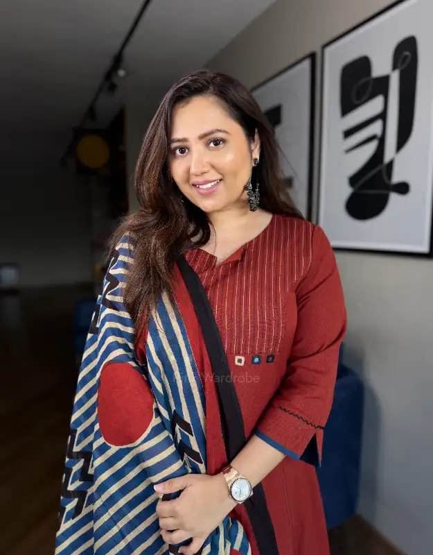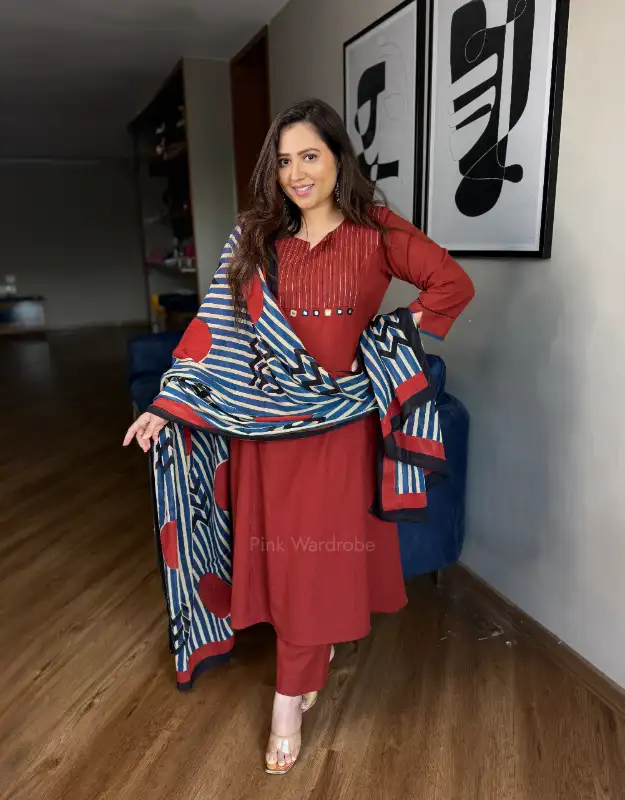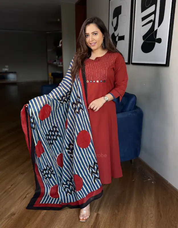 A timeless deep maroon A-line kurta crafted in premium cotton, adorned with real mirror work and intricate thread embroidery on the neckline. The silhouette is elegant yet functional, featuring a side pocket for comfort and paired with smart fitted pants that elevate the overall look. Styled with a stunning Ajrakh-printed dupatta in polka and stripe motifs, this ensemble blends traditional charm with a modern edge — making it a perfect choice for daily wear, office outfits, and even semi-casual gatherings. The rich maroon tone and handcrafted detailing bring a sophisticated flair to your wardrobe, ensuring effortless elegance every day.