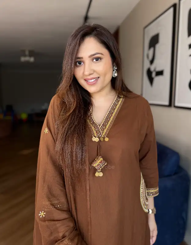 Effortlessly elegant and thoughtfully crafted, this A-line cotton suit set in rich rust and brown hues is designed for modern, confident women. The solid cotton kurta features a flattering V-neckline with intricate embroidery, stylish tassel detailing, and functional side pockets highlighted with delicate machine embroidery—where comfort meets craftsmanship.