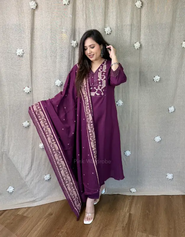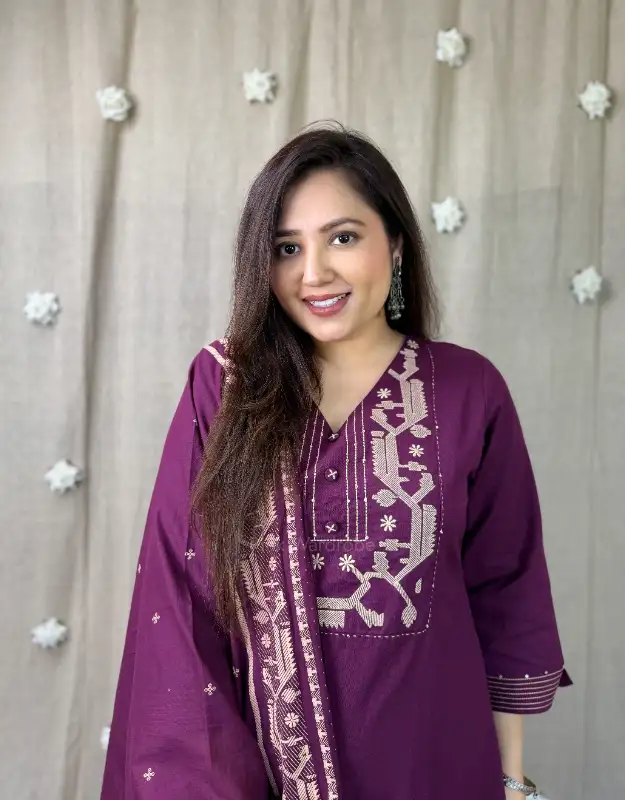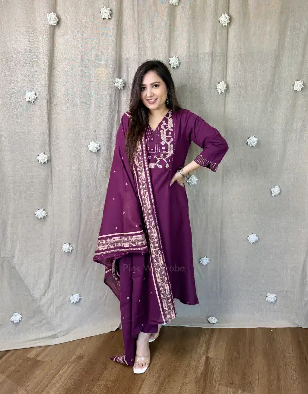 Rich and elegant embroidered suits having embroidered neckline in deep bottle green shade, timeless colors that flatter all age groups and body types. Paired with block-printed dupattas and pants, these sets are perfect for Diwali, Karva Chauth, festive brunches, or wedding pujas. The intricate embroidery adds a royal touch, making it a classy festive must-have.