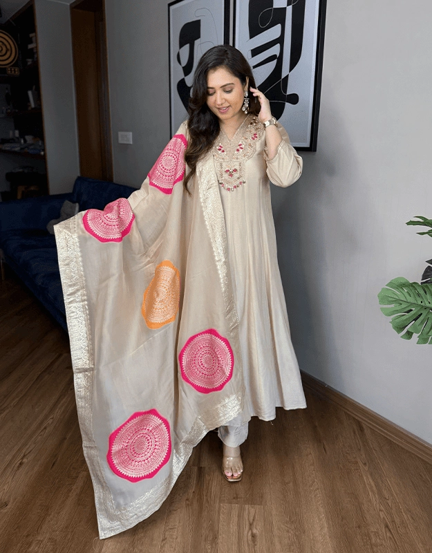 The soothing tone makes it versatile for festivals, weddings, and special occasions, while the structured yet flowy fit ensures a regal look that suits all ages and silhouettes. A perfect ethnic outfit for those who seek modern elegance rooted in tradition.