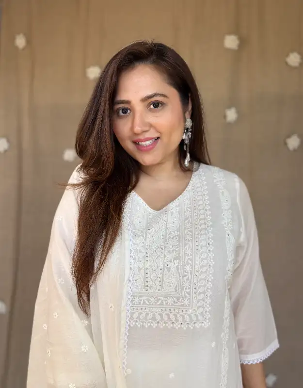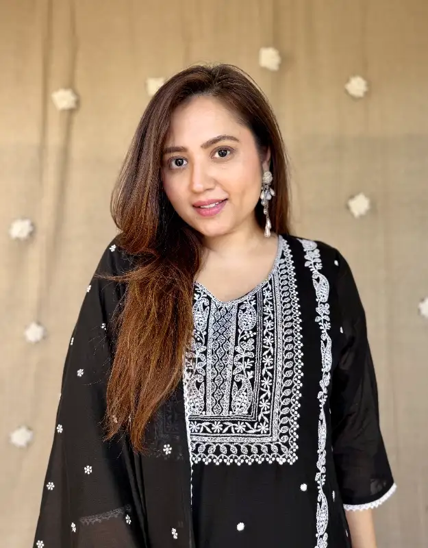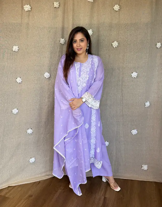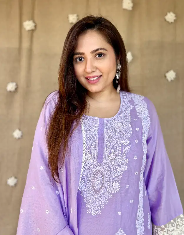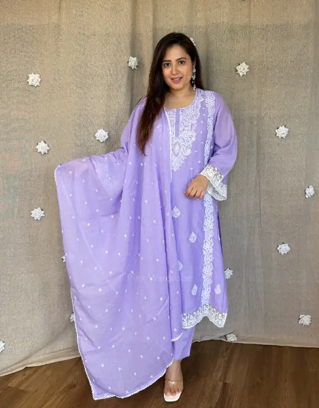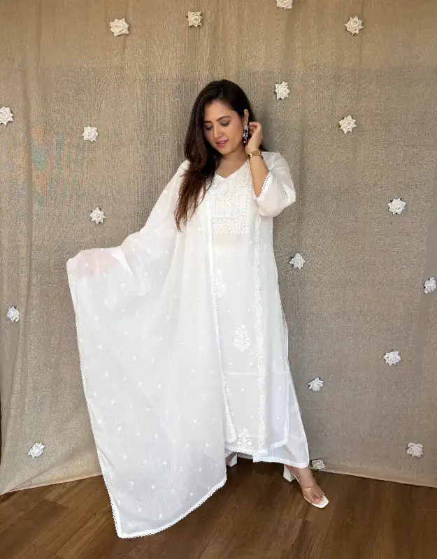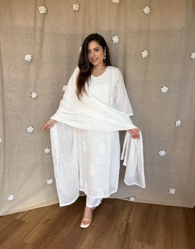 timeless straight-cut Lucknowi Chikankari-inspired suit crafted for effortless elegance and everyday luxury. The kurta features fine machine embroidery inspired by authentic Lucknowi chikankari patterns, offering the same delicate aesthetic with easy maintenance. Designed with a sleek straight silhouette and attached lining, it ensures comfort and structure for all-day wear.