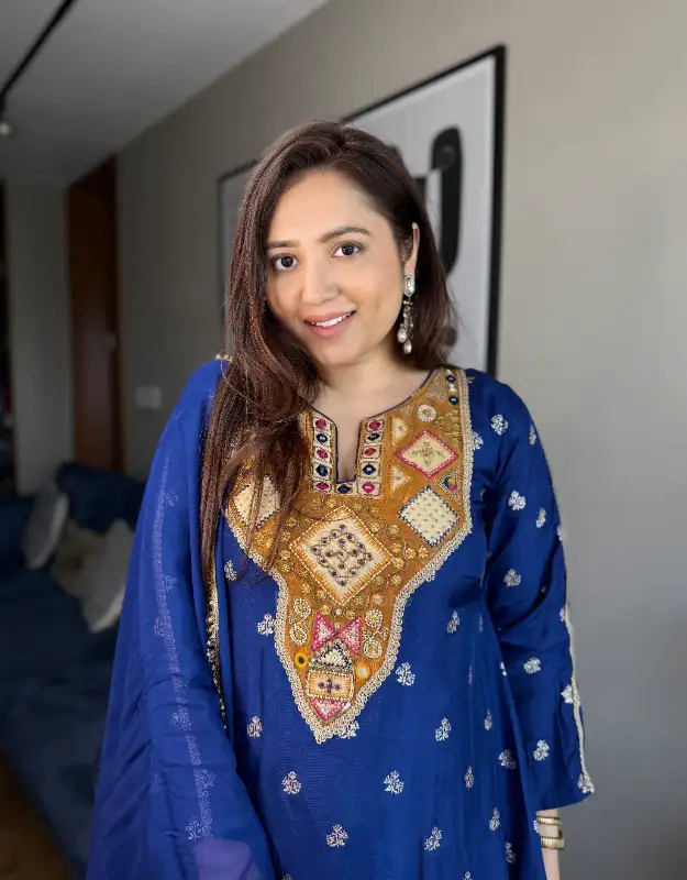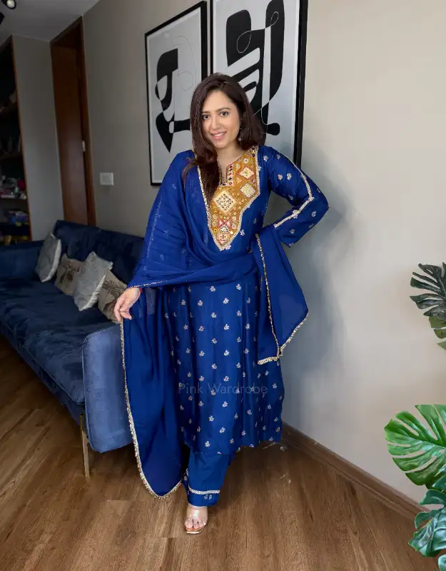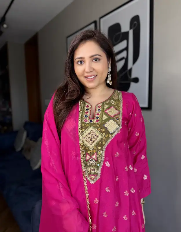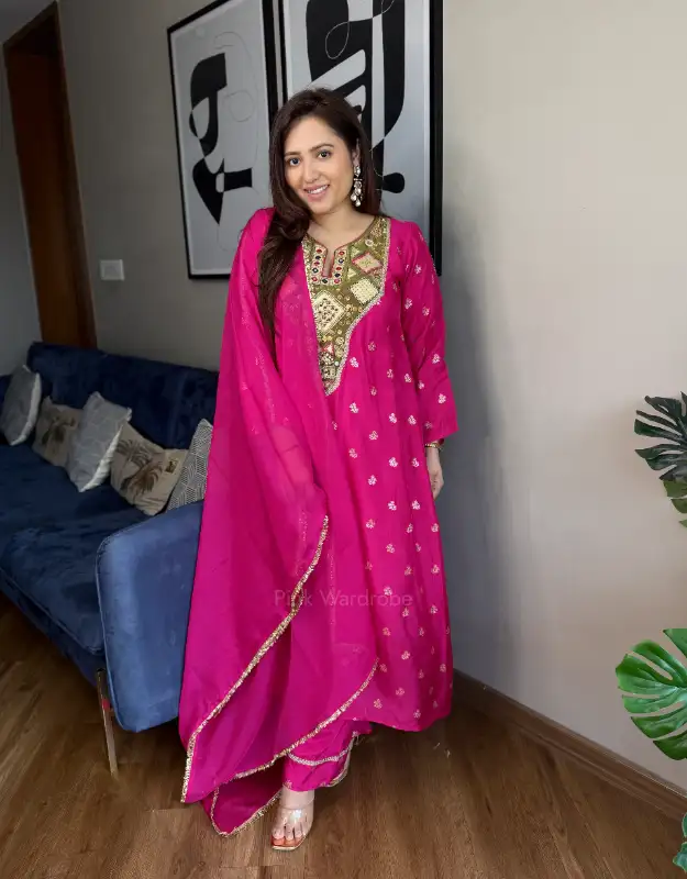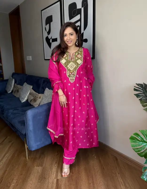 A head-turning fuchsia pink and royal blue silk jacquard bootee suit designed for statement elegance. Crafted in premium silk jacquard, the kurta features a flattering A-line tail cut silhouette with side pockets for comfort and functionality. The contrast tissue neckline with intricate handwork detailing adds a rich festive charm, beautifully balanced with smart tailored pants and a luxurious organza dupatta. A perfect blend of grace and grandeur — ideal for weddings, festive gatherings, and special occasions.