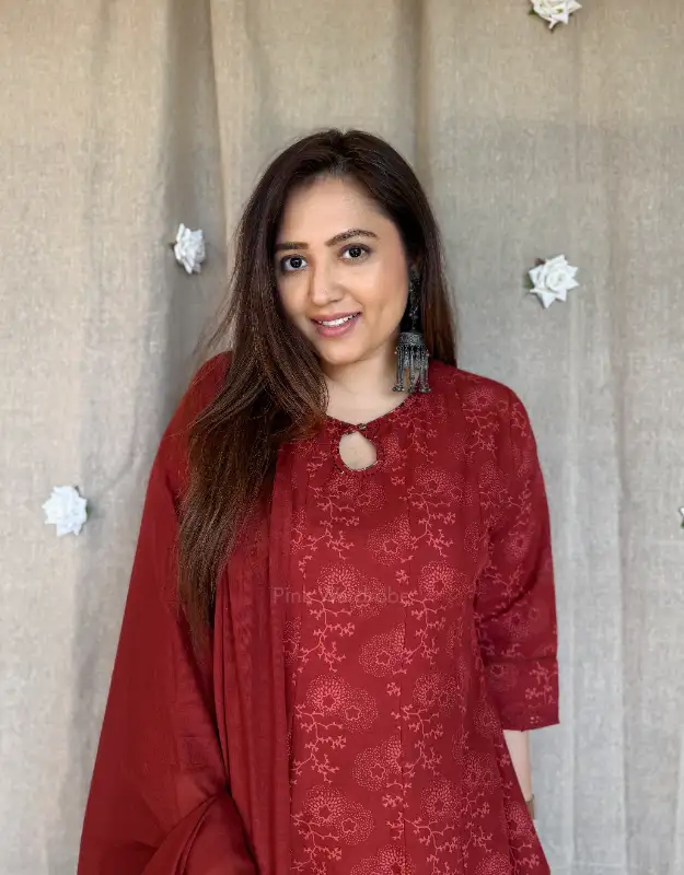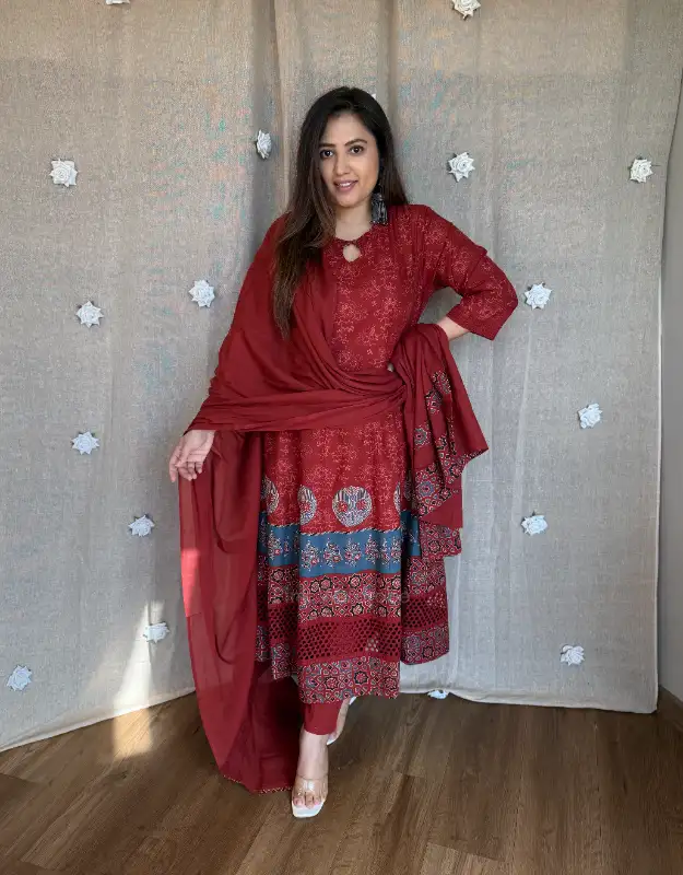 A timeless deep rustic red Ajrakh Anarkali designed with kali cutting for a beautiful flare. Highlighted with Schiffli border detailing, this piece blends heritage craft with modern elegance. Paired with smart pants & Ajrakh dupatta — ideal for Haldi, Mehendi, festive mornings & cultural occasions.