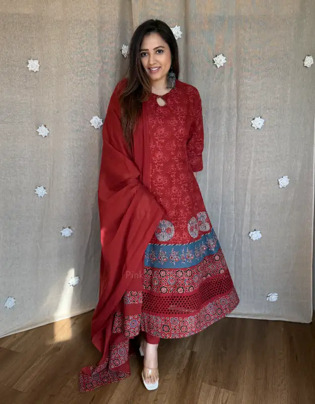 Ajrakh Anarkali suit, handcrafted block print suit, kali Anarkali India, festive ethnic wear, traditional meets modern