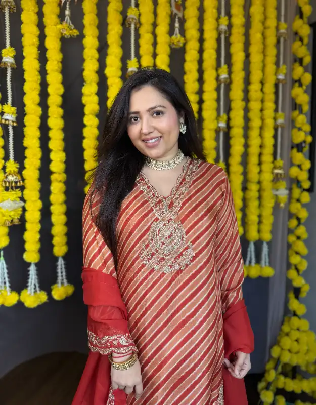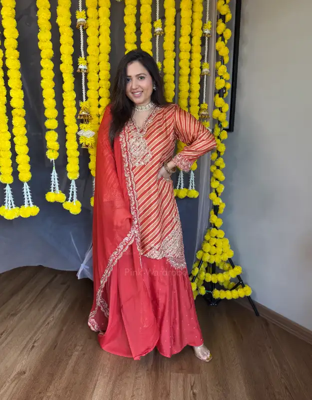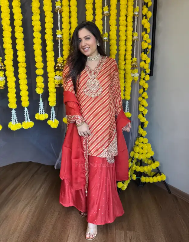 A beautiful Rajasthani Leheriya short kurta adorned with intricate work all over, paired with a flowy sharara featuring exquisite motif and side work detailing. Teamed with a smart pure organza dupatta with delicate work accents, this ensemble is a timeless pick for wedding functions or festive celebrations like Janmashtami, Ganpati, or Diwali. A classic Leheriya print that blends tradition with modern elegance.