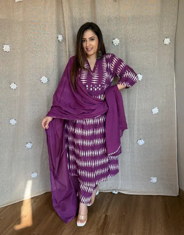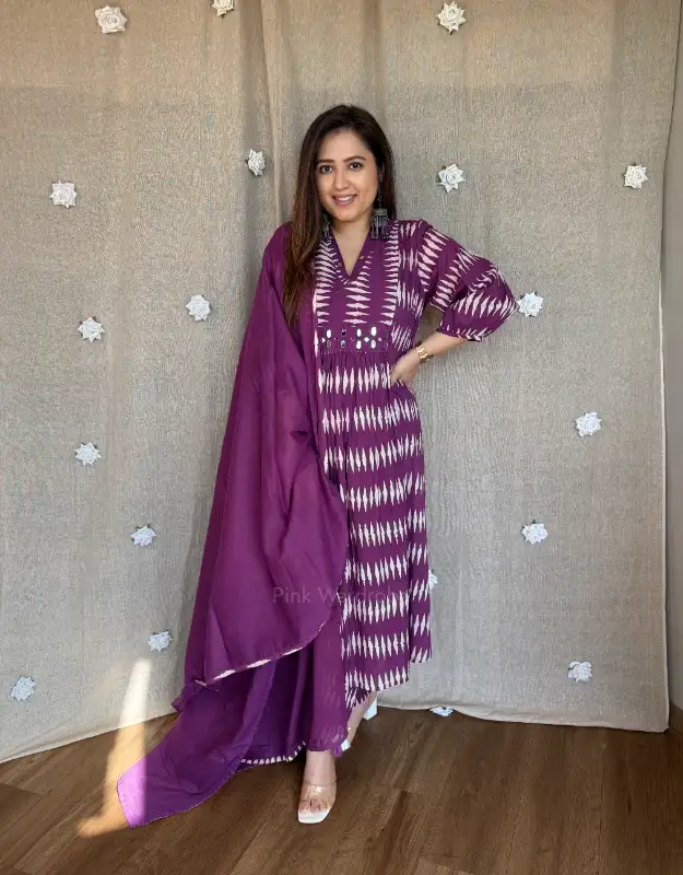 A stunning wine-colored A-line suit crafted for understated luxury. Featuring delicate mirror work on the waist, this silhouette enhances your shape while keeping it elegant and comfortable. Comes with a side pocket, smart pants & a graceful dupatta — making it perfect for festive evenings, small functions & classy gatherings.