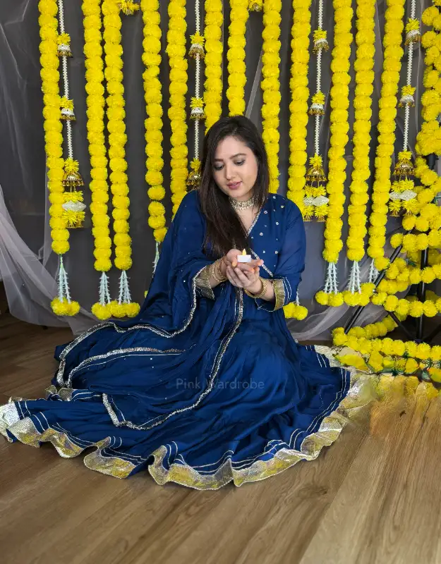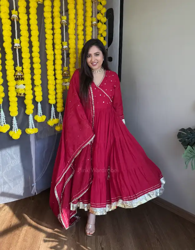 Step into the festive glow with this beautiful HO Silk Anarkali in a vibrant fuchsia pink hue. The flowy silk fabric adds effortless grace, while the gota lacework and real mirror work neckline bring a touch of traditional elegance. Its flattering flare makes it a timeless outfit for Navratri, Eid, Sawan, or weddings – truly perfect for any celebration.