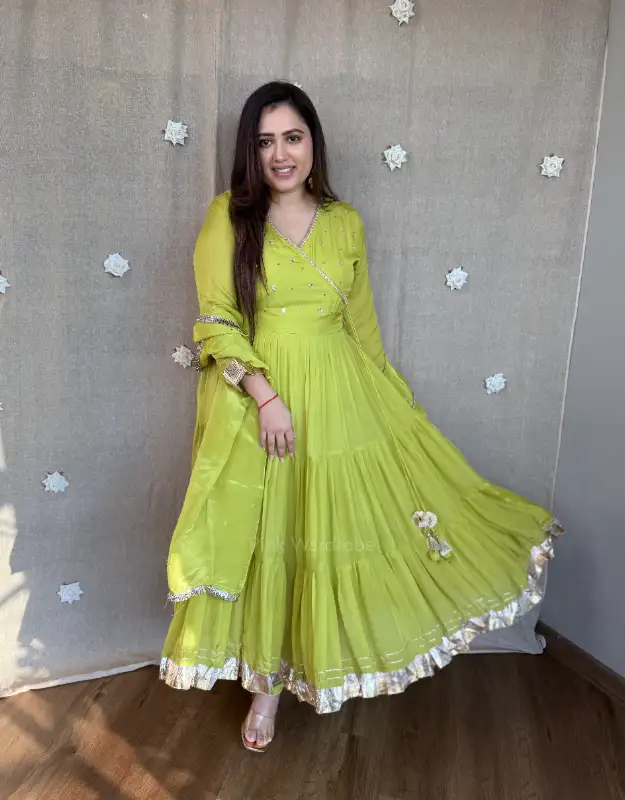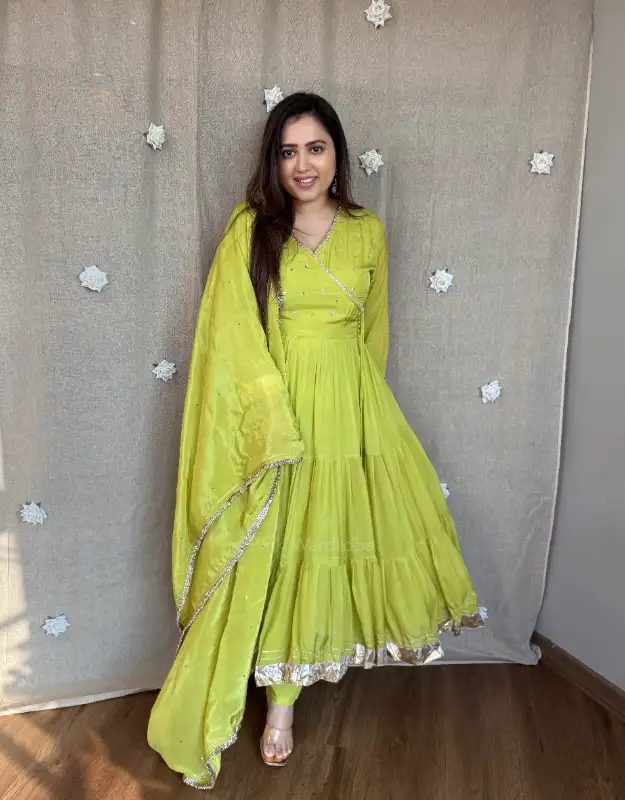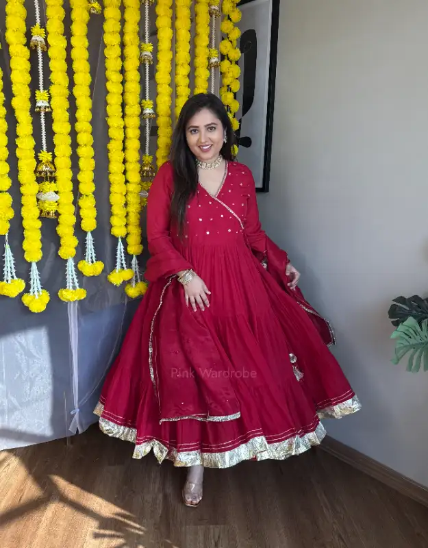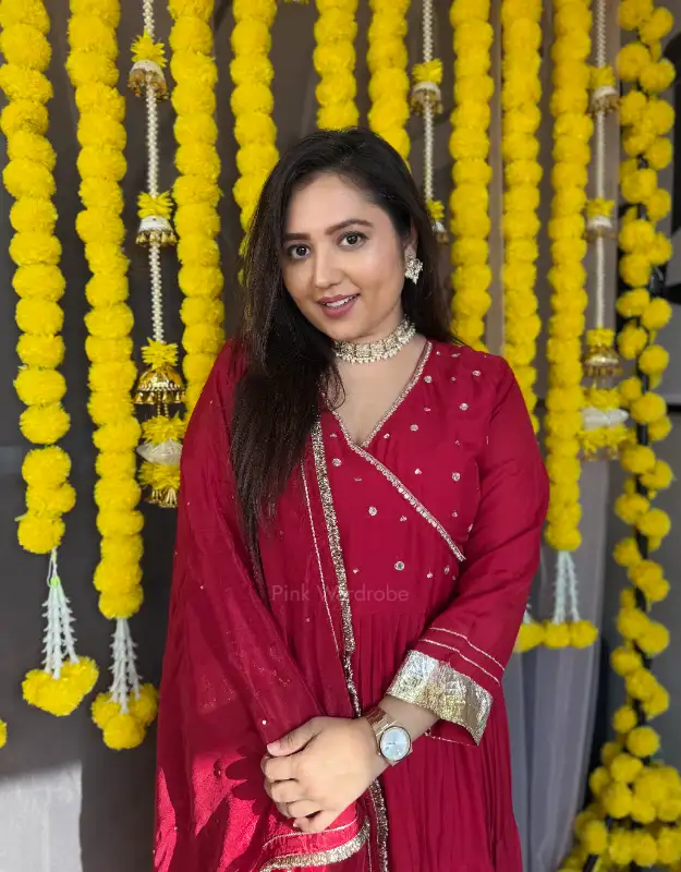 ? A color that symbolizes joy and festivity, this Anarkali is a versatile choice for all age groups, making it a must-have in your festive wardrobe.