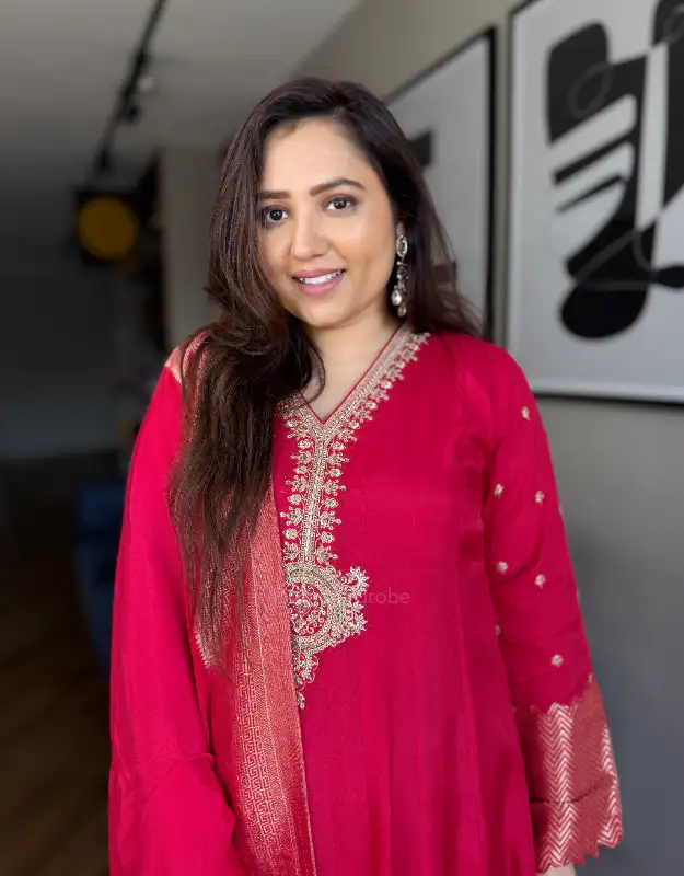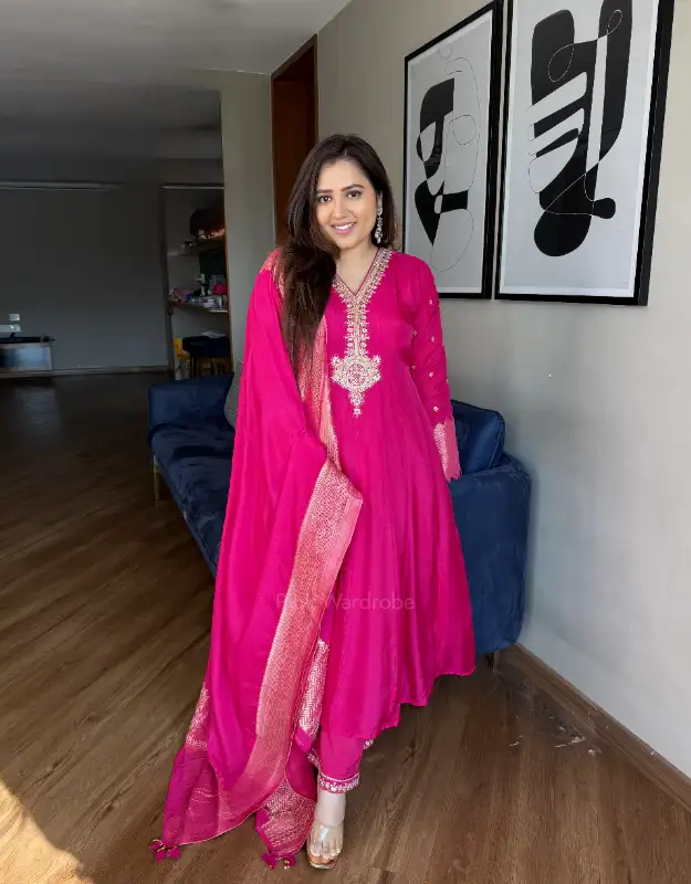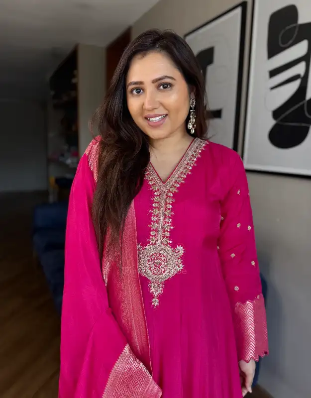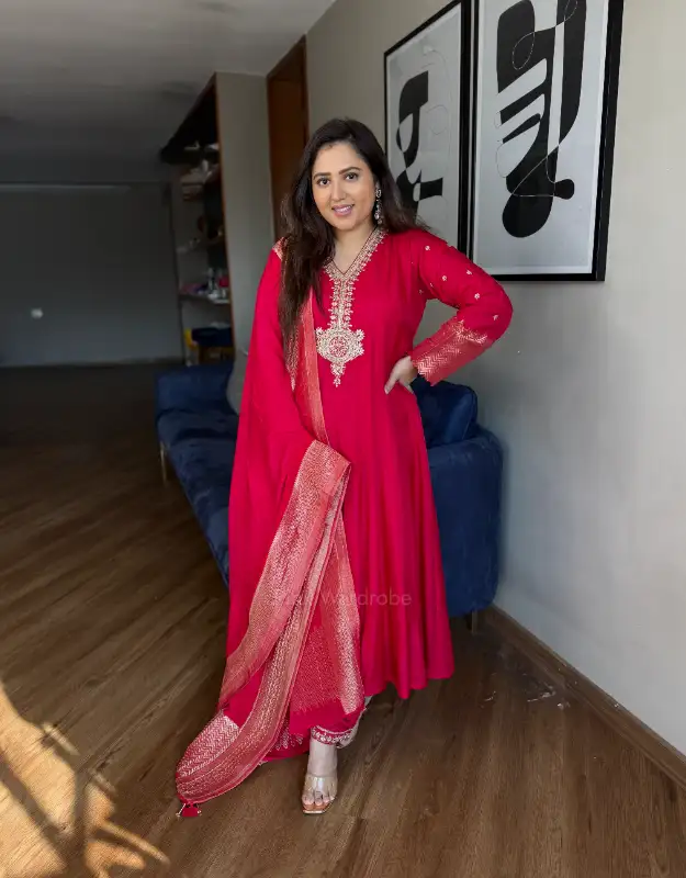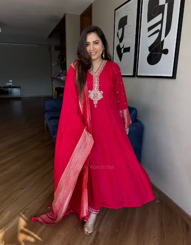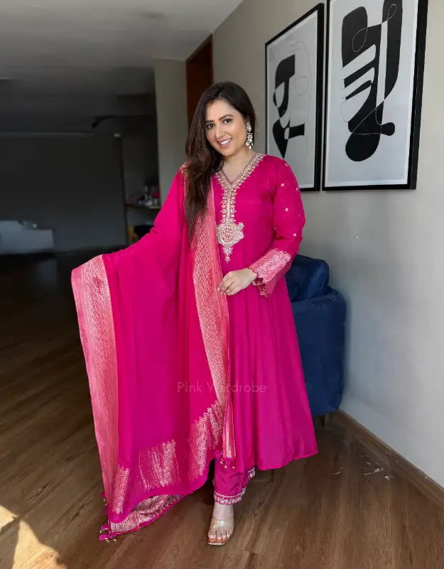 Introducing our Bright Hues Anarkali Edit — a stunning combination of luxury and tradition. Crafted in premium Russian silk, this Anarkali features shoulder pleated kali detailing that enhances the silhouette and gives a perfect flowy fit. The heavily embellished neckline adds grandeur, while the zari weave sleeves bring a royal touch. Paired with a Chinon jacquard dupatta adorned with zari weaving all over, it completes the look with elegance and grace. The back of the kurta also features delicate handwork, paired with smart pants for a modern edge. Available in two timeless festive colors — bright red and fuchsia pink, perfect for your wedding functions, haldi, mehendi, sangeet, and festive celebrations. A classy, graceful, and statement-worthy outfit that exudes royalty and charm.