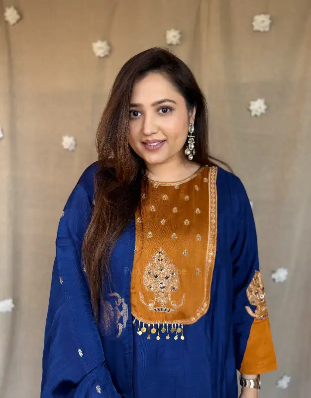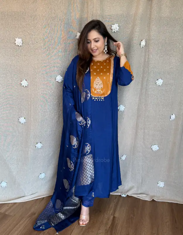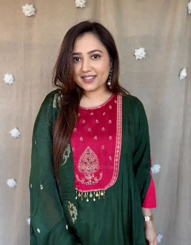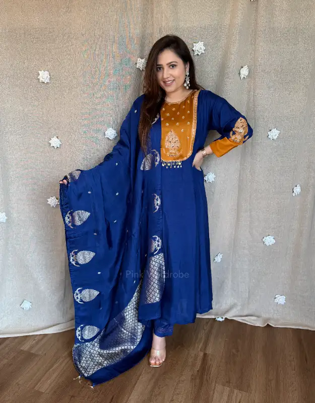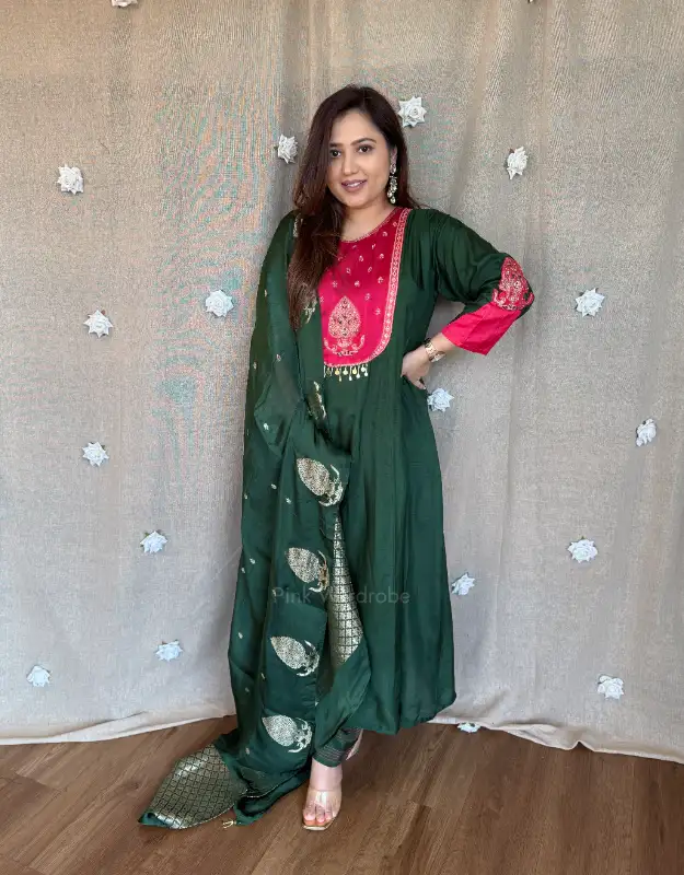 A stunning Dola Silk Anarkali, available in vibrant green and festive yellow, designed for Haldi, Mehendi, weddings, and all festive celebrations. Crafted in a shoulder-panel Anarkali silhouette, it creates a graceful, flowy fall that looks elegant yet modern. Paired with a luxurious satin silk dupatta featuring rich zari weaving, this ensemble brings timeless charm with a refined festive appeal — perfect for bridesmaids, wedding guests, and celebration dressing.
