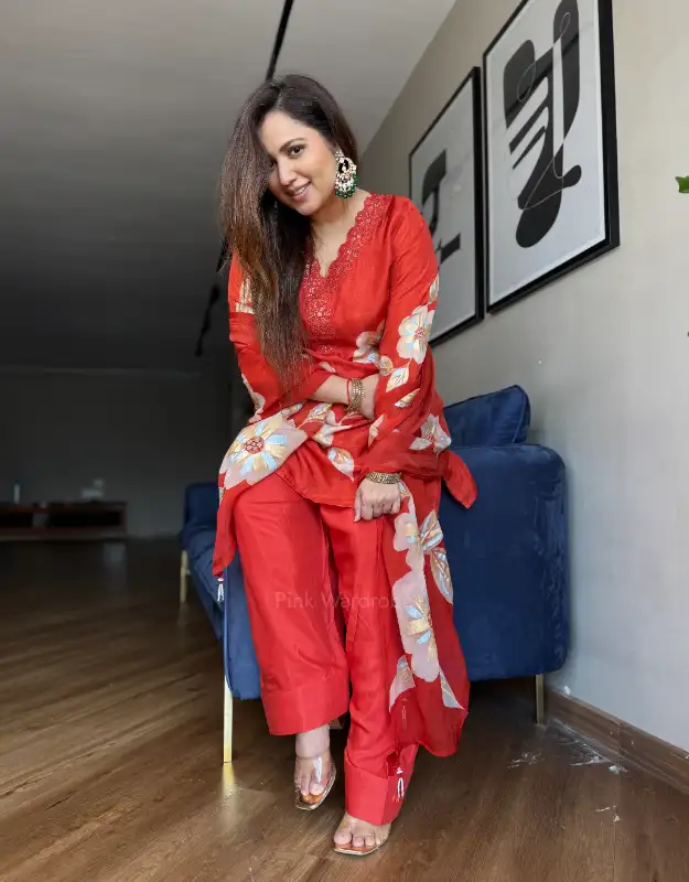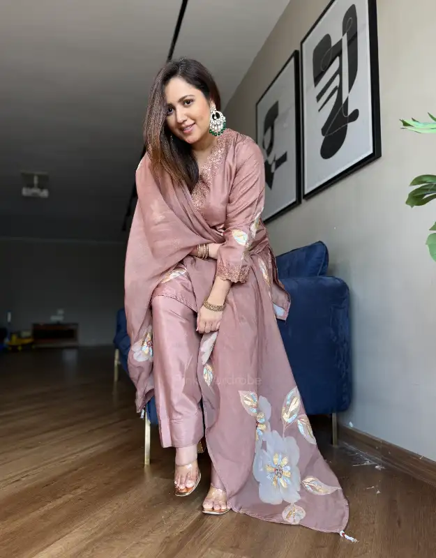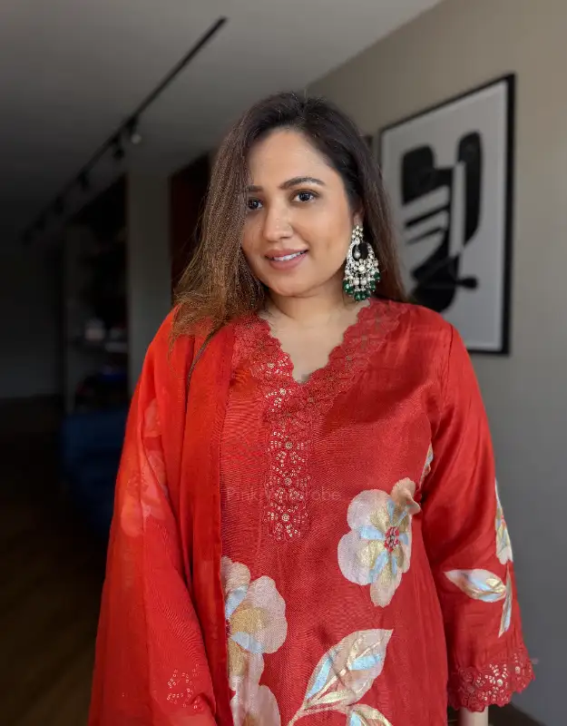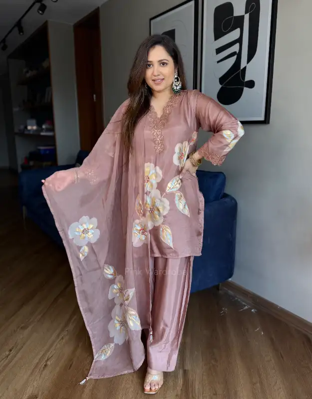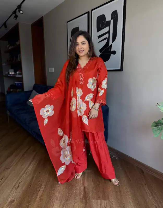 graceful statement of timeless elegance, this beautiful Farshi salwar suit is crafted for women who love effortless luxury with comfort. The Russian silk top features artistic brush-paint detailing, enhanced with delicate embroidery on the neckline and sleeves, adding a refined festive charm. Paired with a flowy gold-lined Farshi salwar, the silhouette creates a regal yet breathable drape. The look is completed with a pure organza dupatta adorned with subtle brush-paint accents — perfect for post-wedding wear, small pujas, family gatherings, intimate celebrations, and elegant everyday occasions. A versatile ensemble designed for modern women seeking stylish, comfortable, and reusable wedding wear