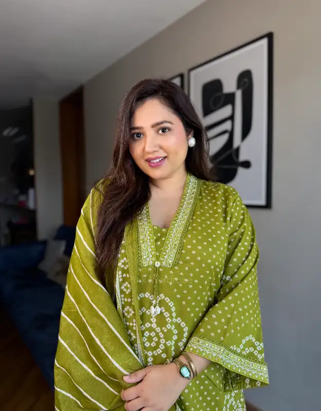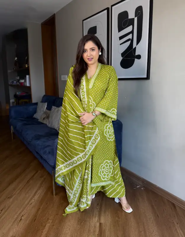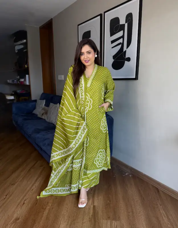 This Bandhej-and-Leheriya ensemble exudes a festive charm — ideal for daily wear, office wear, small get-togethers, pujas, or pre-wedding festivities. The breathable cotton fabric ensures all-day comfort, making it perfect for humid weather while adding a touch of elegance to your wedding shopping and trousseau wardrobe for the 2025-26 wedding season.