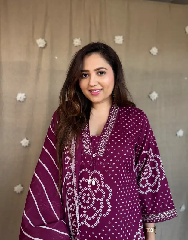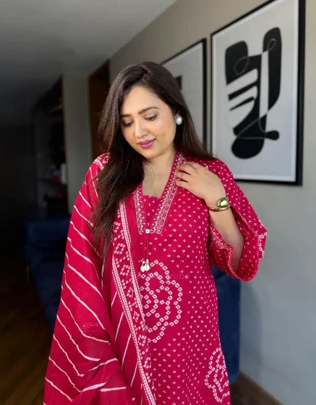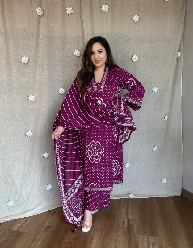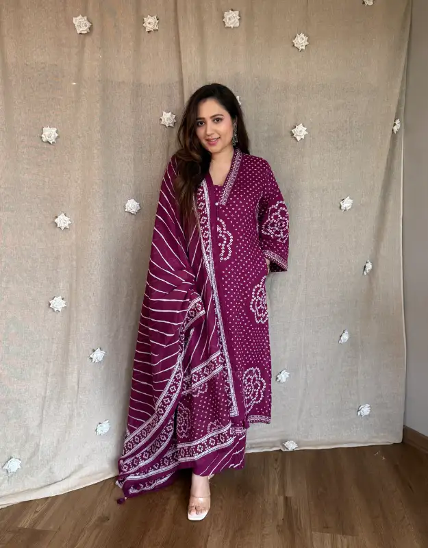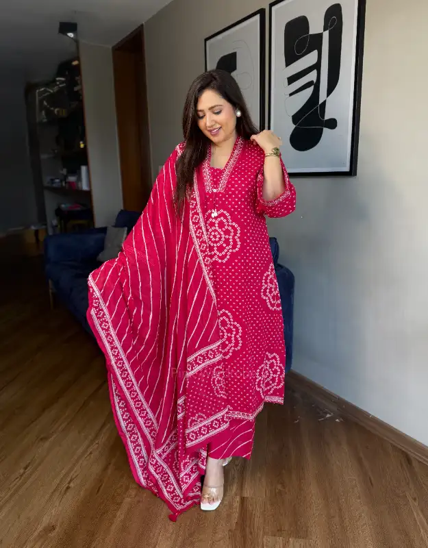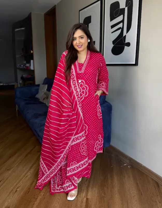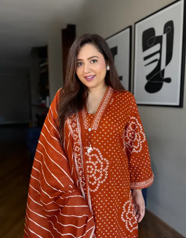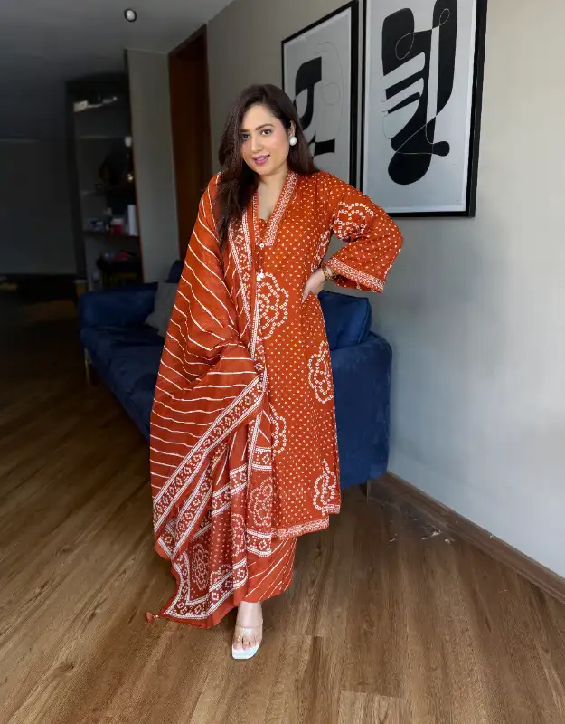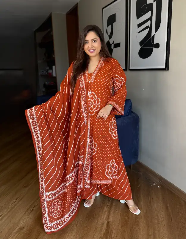 A beautiful Bandhej print premium cotton suit crafted in a flattering A-line silhouette, designed for effortless elegance and everyday comfort. The kurta features two practical side pockets and is paired with smart leheriya-print palazzo pants, creating a perfect fusion of traditional and contemporary style. It comes with a soft mul-mul leheriya dupatta, completing the look in a stunning rust-orange trending shade.