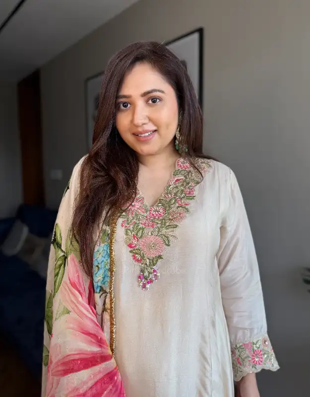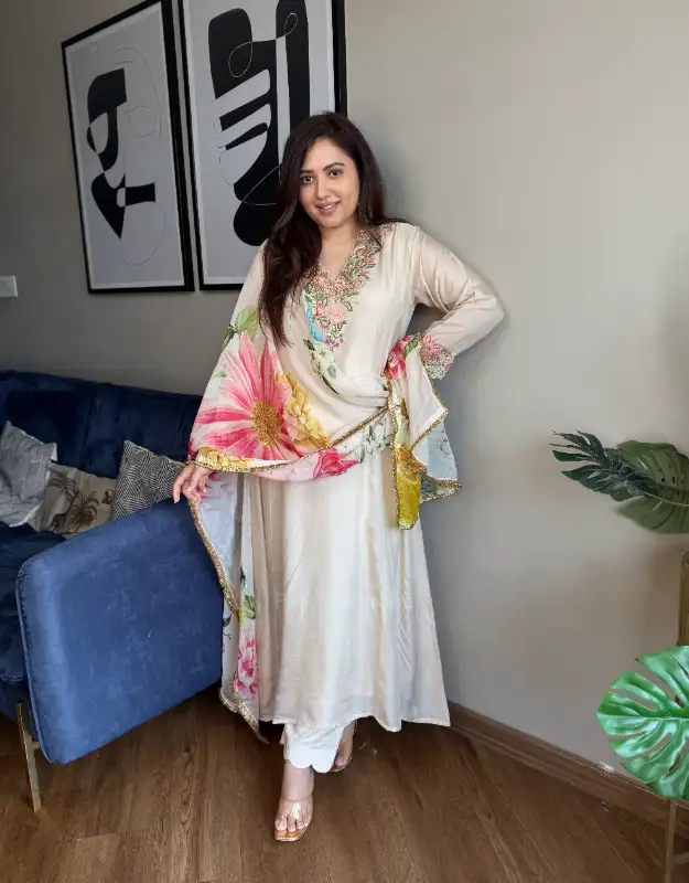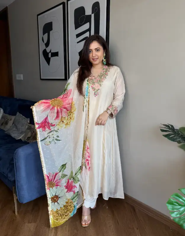 An effortlessly regal ivory Anarkali suit set crafted for the premium festive wardrobe — featuring a beautifully embroidered neckline that instantly elevates the look. Styled with a premium organza dupatta finished with kiran lace and delicate floral motifs, this ensemble feels light, luxe, and photo-ready. Paired with smart pants with scallop detailing on the hem for that polished designer finish. A perfect pick for Engagement, Roka, Sangeet, Mehendi, Haldi, Cocktail, Reception, Wedding Guest looks, and elegant family get-togethers — ideal for customers searching designer suit set, luxury ethnic wear, premium anarkali suit, party wear suit set, organza suit set, wedding suit for women, bridesmaid outfit and occasion wear