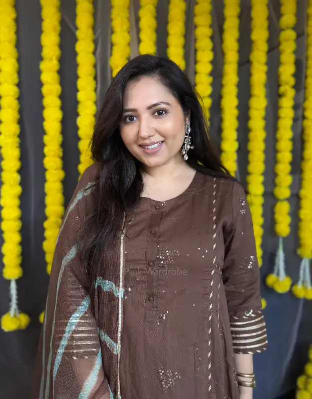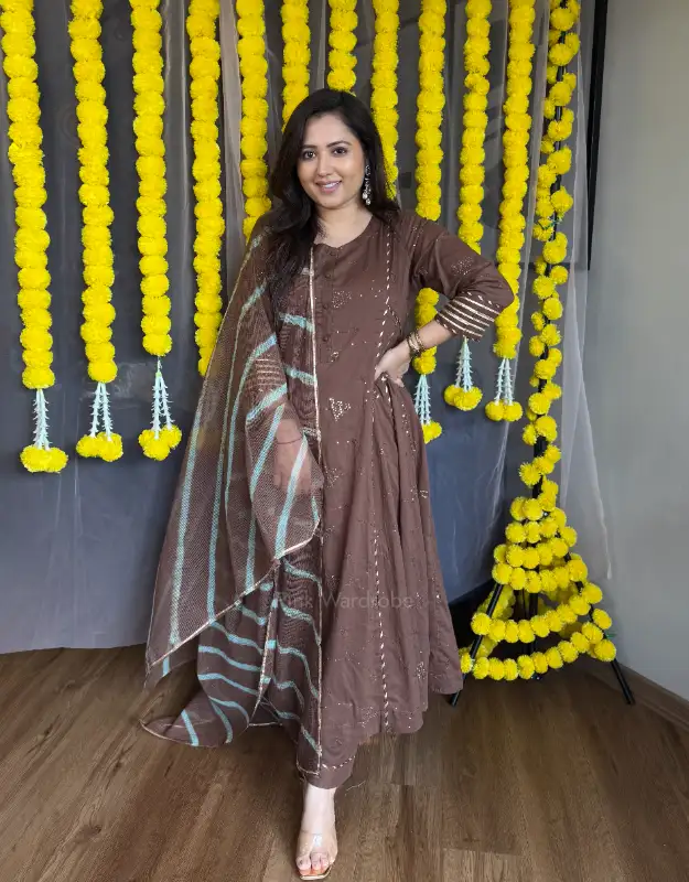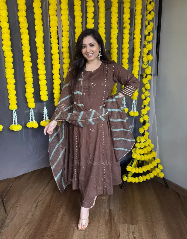 Mocha Brown Cotton Anarkali: A rich mocha brown cotton suit in a flattering A-line Anarkali silhouette, featuring heavy embellishment all over, paired with smart pants and a premium turquoise–brown leheriya Kota Doria dupatta. A regal festive pick with a unique color contrast.